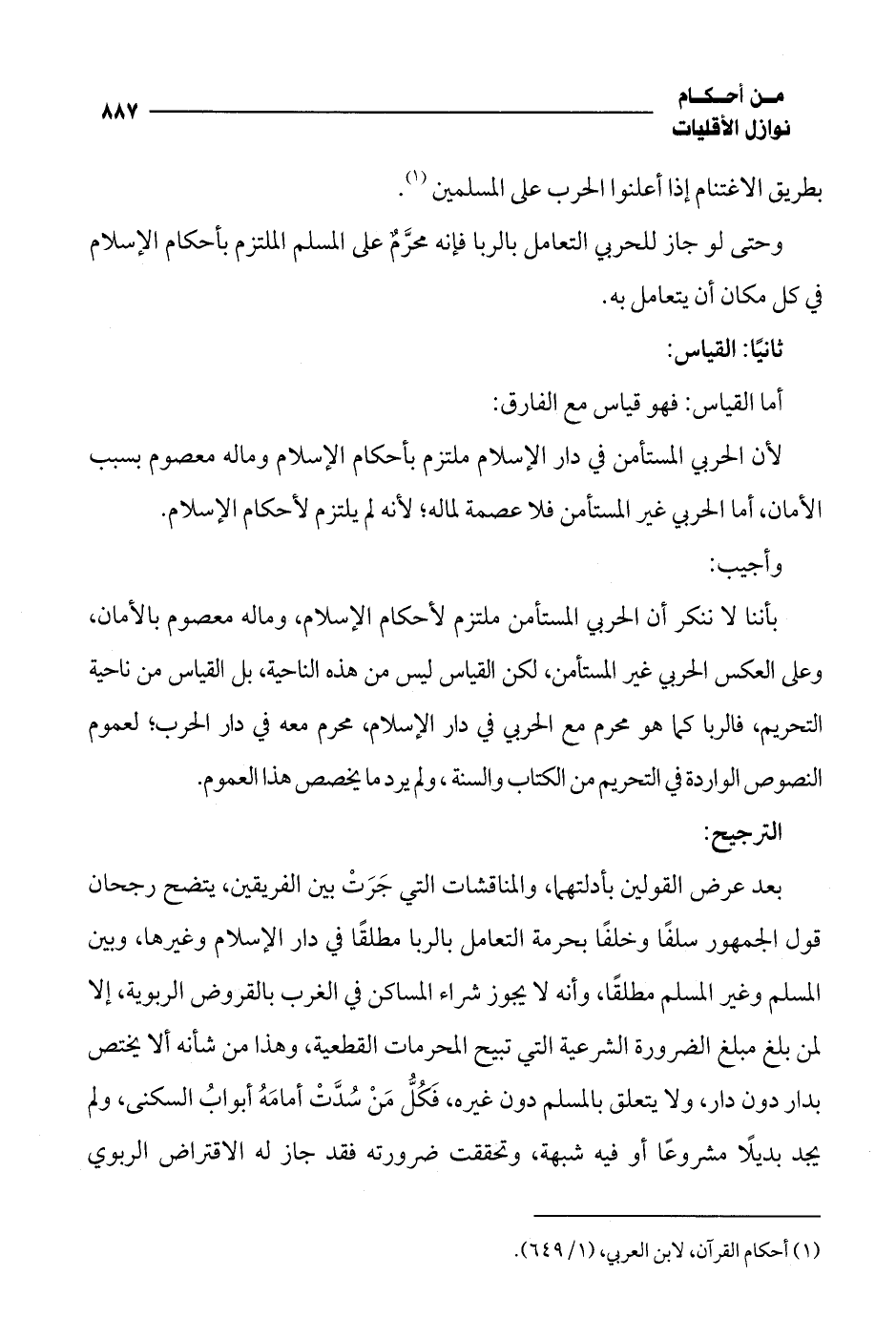 بأننا لا ننكر أن الحربي المستأمن ملتزم لأحكام الإسلام، وماله معصوم بالأمان، وعلى العكس الحربي غير المستأمن، لكن القياس ليس من هذه الناحية، بل القياس من ناحية التحريم، فالربا كما هو محرم مع الحربي في دار الإسلام، محرم معه في دار الحرب؛ لعموم النصوص الواردة في التحريم من الكتاب والسنة، ولم يرد ما يخصص هذا العموم.