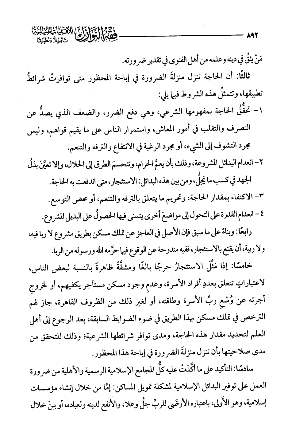 خامسًا: إذا مَثَّلَ الاستئجارُ حرجًا بالغًا ومشقَّةً ظاهرةً بالنسبة لبعض الناس، لاعتباراتٍ تتعلق بعددِ أفراد الأسرة، وعدمِ وجود مسكن مستأجر يكفيهم، أو لخروجِ أجرته عن وُسْعِ ربِّ الأسرة وطاقته، أو لغير ذلك من الظروف القاهرة، جاز لهم الترخص في تملك مسكن بهذا الطريق في ضوء الضوابط السابقة، بعد الرجوع إلى أهل العلم لتحديد مقدار هذه الحاجة، ومدى توافر شرائطها الشرعية؛ وذلك للتحقق من مدى صلاحيتها بأن تنزل منزلةَ الضرورة في إباحة هذا المحظور.