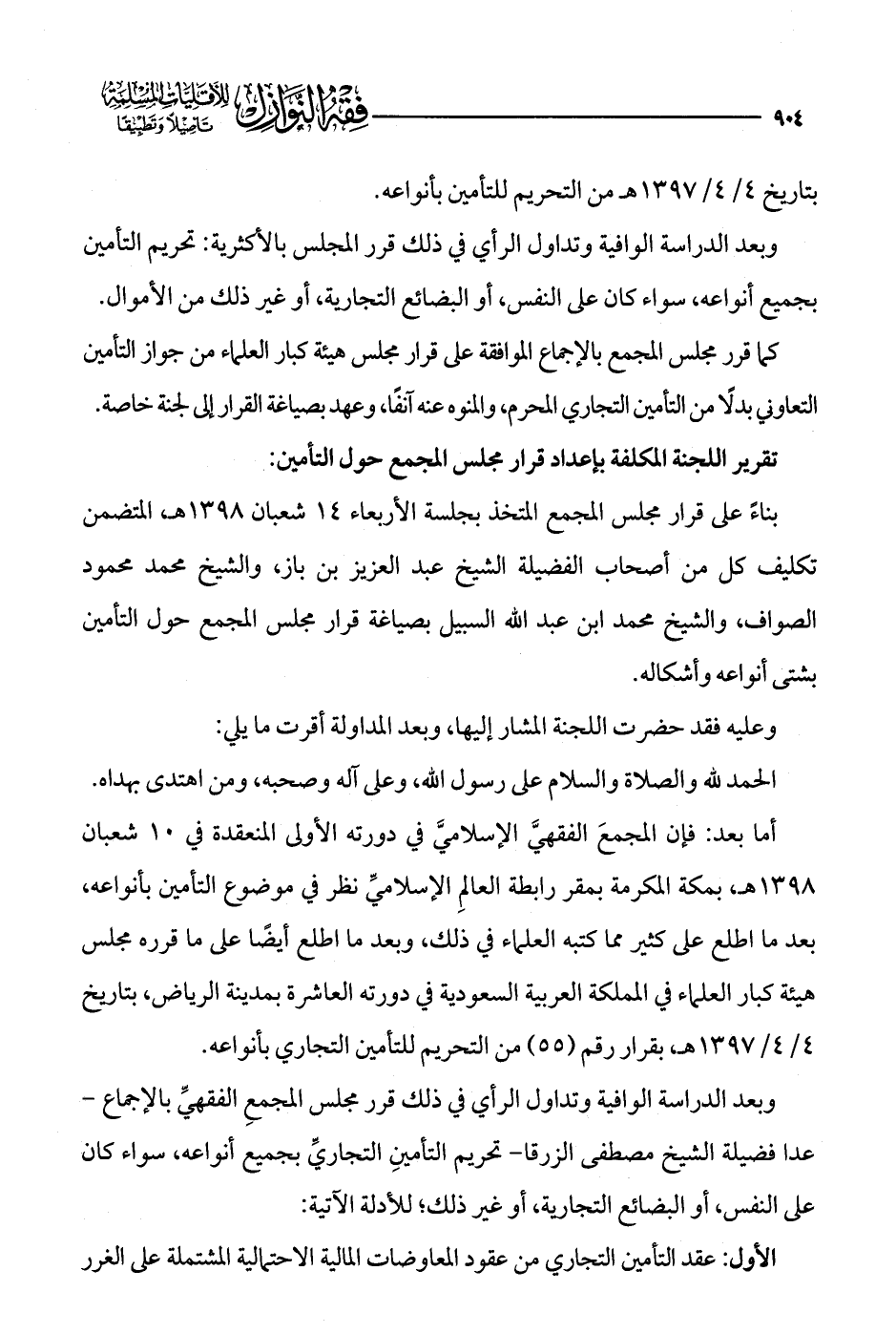 بناءً على قرار مجلس المجمع المتخذ بجلسة الأربعاء 14 شعبان 1398 هـ، المتضمن تكليف كل من أصحاب الفضيلة الشيخ عبد العزيز بن باز، والشيخ محمد محمود الصواف، والشيخ محمد ابن عبد الله السبيل بصياغة قرار مجلس المجمع حول التأمين بشتى أنواعه وأشكاله.