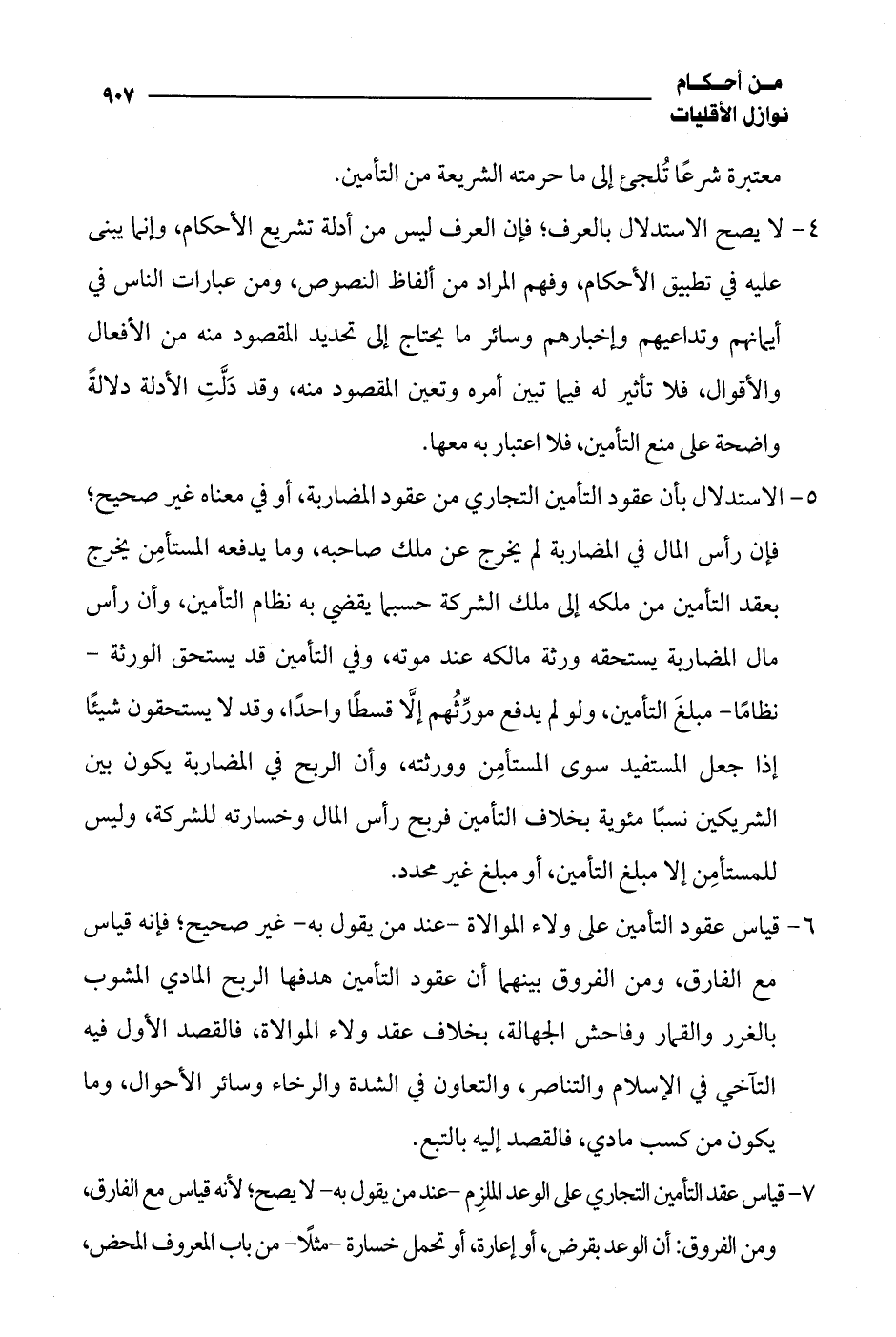 4 - لا يصح الاستدلال بالعرف؛ فإن العرف ليس من أدلة تشريع الأحكام، وإنما يبنى عليه في تطبيق الأحكام، وفهم المراد من ألفاظ النصوص، ومن عبارات الناس في أيمانهم وتداعيهم وإخبارهم وسائر ما يحتاج إلى تحديد المقصود منه من الأفعال والأقوال، فلا تأثير له فيما تبين أمره وتعين المقصود منه، وقد دَلَّتِ الأدلة دلالةً واضحة على منع التأمين، فلا اعتبار به معها.
