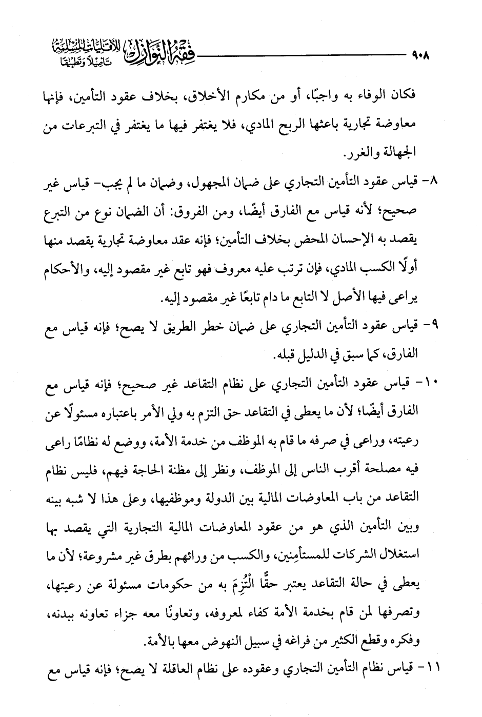 9 - قياس عقود التأمين التجاري على ضمان خطر الطريق لا يصح؛ فإنه قياس مع الفارق، كما سبق في الدليل قبله.