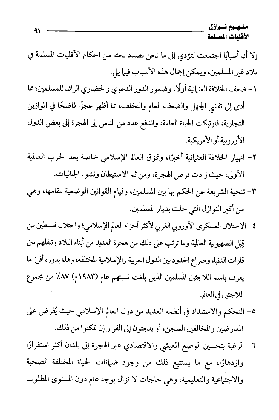 4 - الاحتلال العسكري الأوروبي الغربي لأكثر أجزاء العالم الإسلامي؛ واحتلال فلسطين من قِبَل الصهيونية العالمية وما ترتب على ذلك من هجرة العديد من أبناء البلاد وتنقلهم بين قارات الدنيا، وصراع الحدود بين الدول العربية والإسلامية المختلفة، وهذا بدوره أفرز ما يعرف باسم اللاجئين المسلمين الذين بلغت نسبتهم عام (1983 م) 87 % من مجموع اللاجئين في العالم.