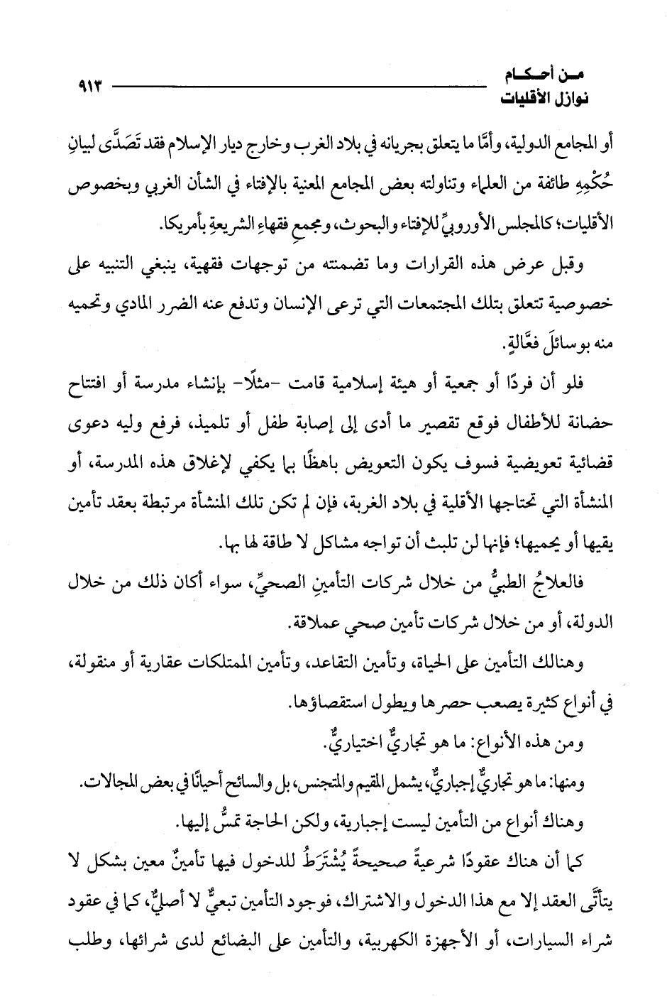 فلو أن فردًا أو جمعية أو هيئة إسلامية قامت -مثلًا- بإنشاء مدرسة أو افتتاح حضانة للأطفال فوقع تقصير ما أدى إلى إصابة طفل أو تلميذ، فرفع وليه دعوى قضائية تعويضية فسوف يكون التعويض باهظًا بما يكفي لإغلاق هذه المدرسة، أو المنشأة التي تحتاجها الأقلية في بلاد الغربة، فإن لم تكن تلك المنشأة مرتبطة بعقد تأمين يقيها أو يحميها؛ فإنها لن تلبث أن تواجه مشاكل لا طاقة لها بها.