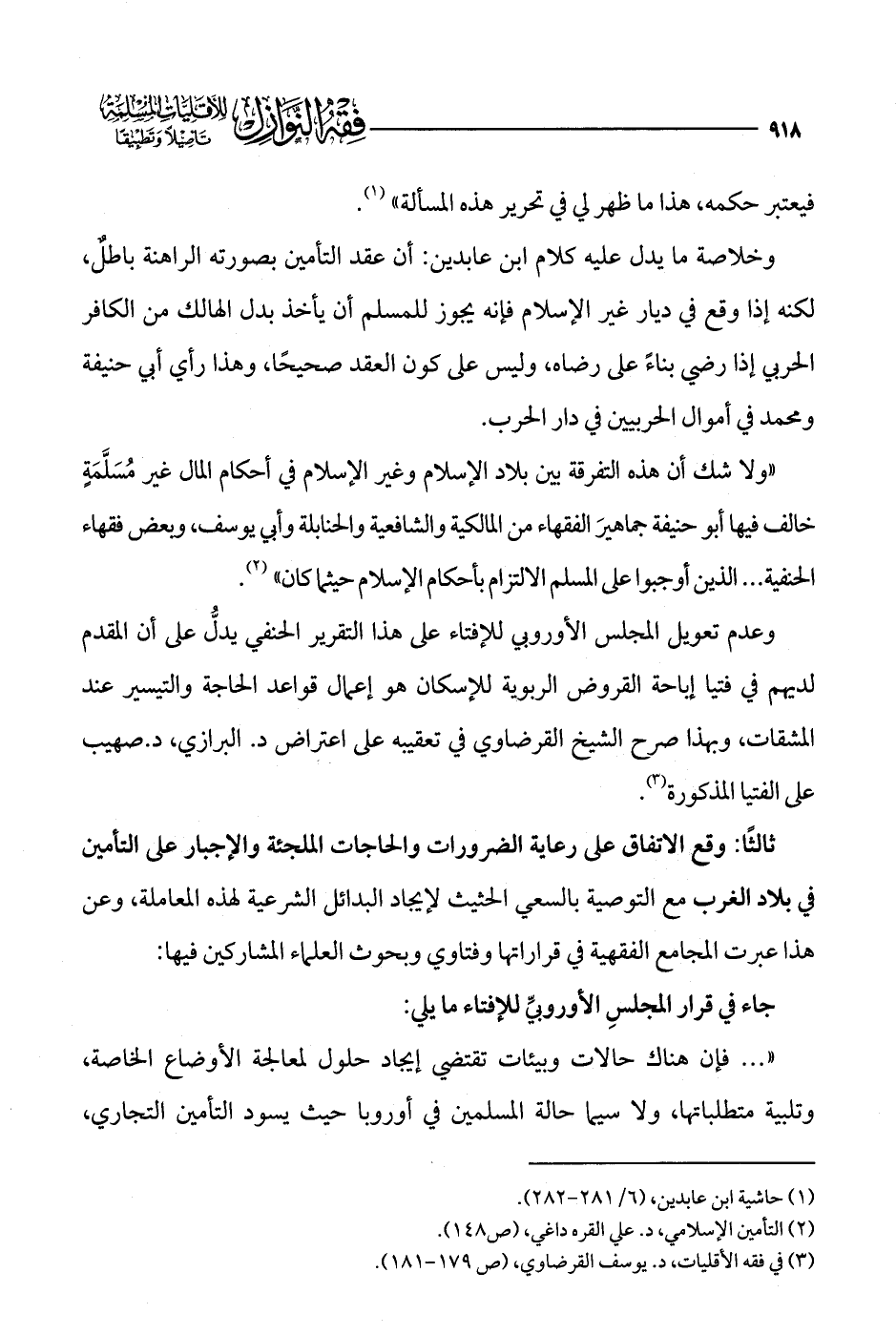 ". . . فإن هناك حالات وبيئات تقتضي إيجاد حلول لمعالجة الأوضاع الخاصة، وتلبية متطلباتها، ولا سيما حالة المسلمين في أوروبا حيث يسود التأمين التجاري،