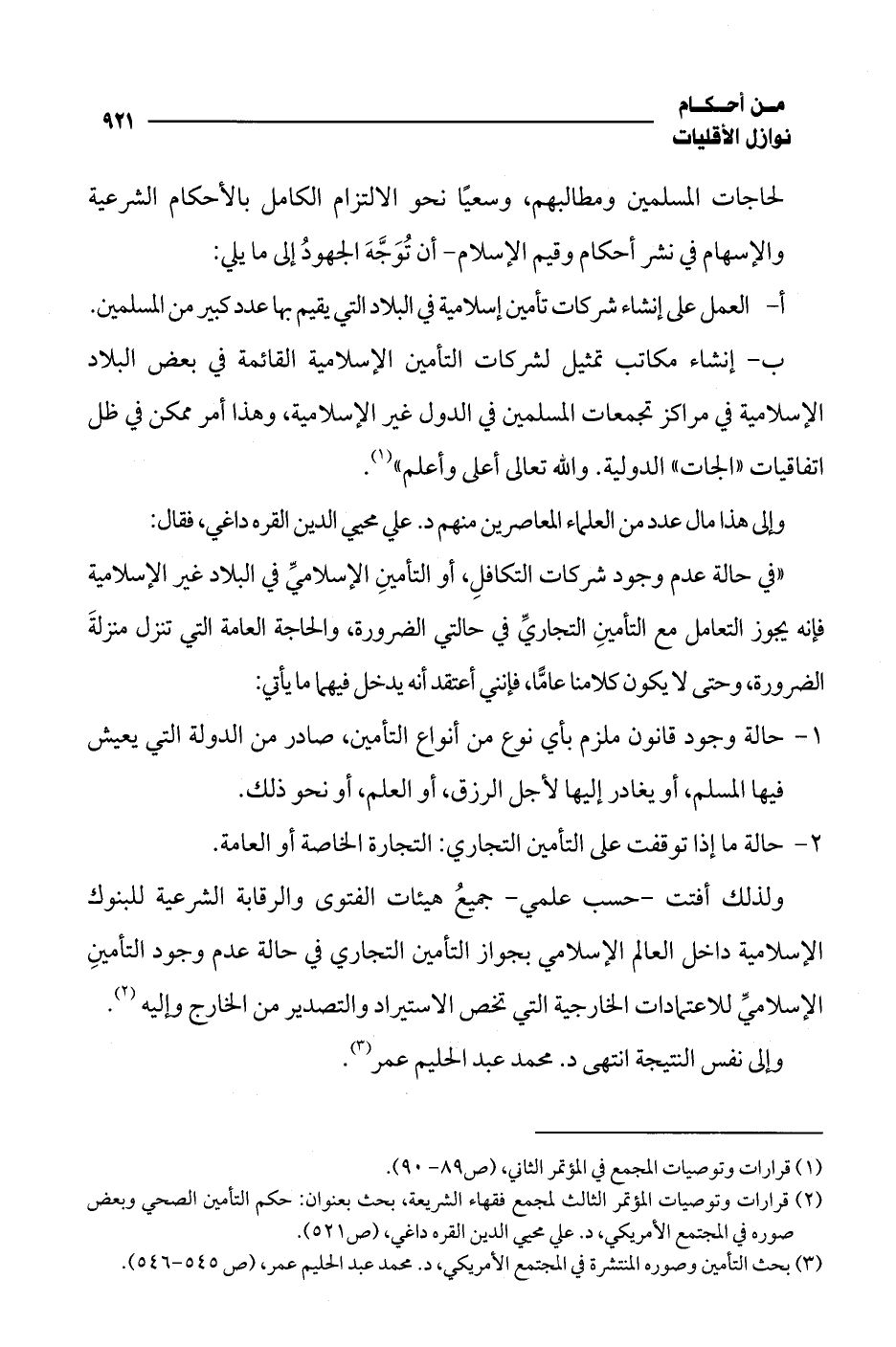 (¬2) قرارات وتوصيات المؤتمر الثالث لمجمع فقهاء الشريعة، بحث بعنوان: حكم التأمين الصحي وبعض صوره في المجتمع الأمريكي، د. علي محيي الدين القره داغي، (ص 521).