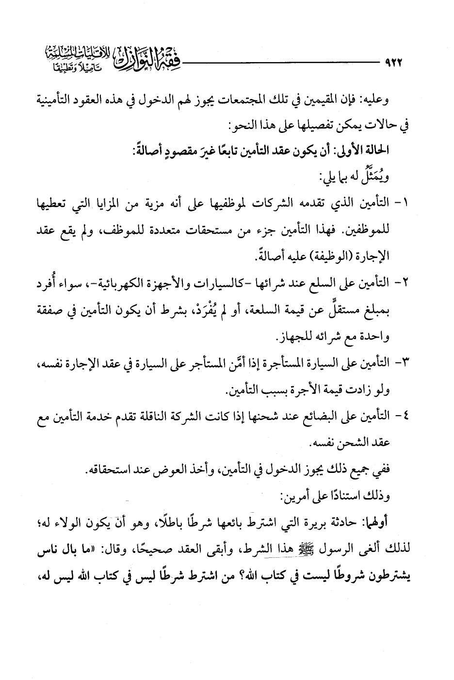 2 - التأمين على السلع عند شرائها -كالسيارات والأجهزة الكهربائية-، سواء أُفرد بمبلغ مستقلٍّ عن قيمة السلعة، أو لم يُفْرَدْ، بشرط أن يكون التأمين في صفقة واحدة مع شرائه للجهاز.