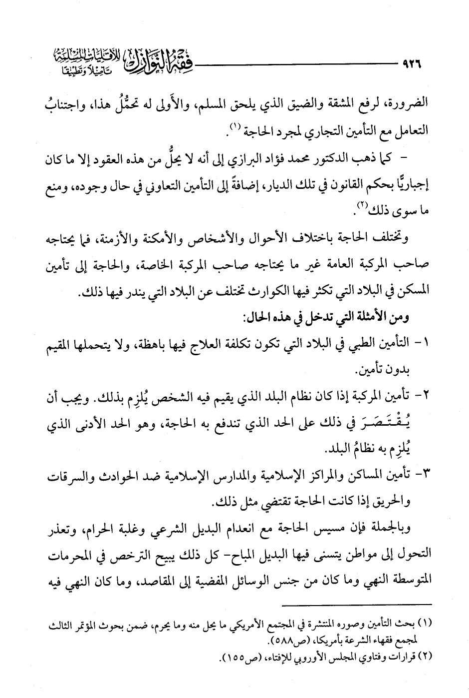 (¬1) بحث التأمين وصوره المنتشرة في المجتمع الأمريكي ما يحل منه وما يحرم، ضمن بحوث المؤتمر الثالث لمجمع فقهاء الشرعة بأمريكا، (ص 588).