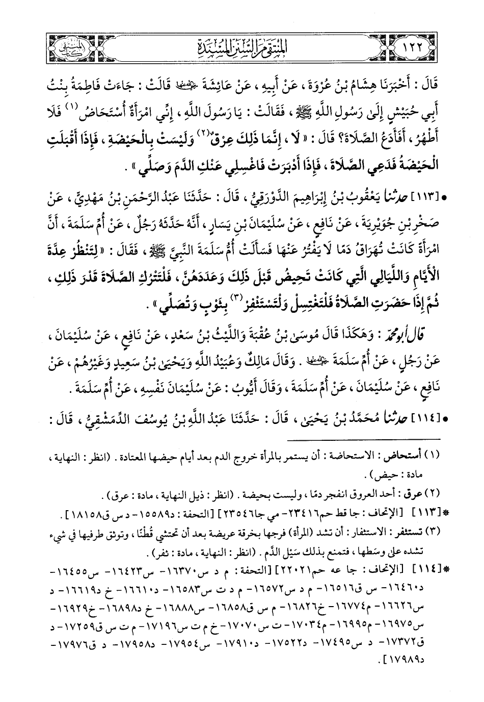 113- حَدَّثَنَا يَعْقُوبُ بْنُ إِبْرَاهِيمَ الدَّوْرَقِيُّ، قَالَ: حَدَّثَنَا عَبْدُ الرَّحْمَنِ بْنُ مَهْدِيٍّ، عَنْ صَخْرِ بْنِ جُوَيْرِيَةَ، عَنْ نَافِعٍ، عَنْ سُلَيْمَانَ بْنِ يَسَارٍ، أَنَّهُ حَدَّثَهُ رَجُلٌ، عَنْ أُمِّ سَلَمَةَ، أَنَّ امْرَأَةً كَانَتْ تُهَرَاقُ دَمًا لاَ يَفْتُرُ عَنْهَا فَسَأَلَتْ أُمُّ سَلَمَةَ النَّبِيَّ صَلى الله عَليه وسَلم فَقَالَ: لِتَنْظُرْ عِدَّةَ الأَيَّامِ وَاللَّيَالِي الَّتِي كَانَتْ تَحِيضُ قَبْلَ ذَلِكَ وَعَدَدَهُنَّ فَلْتَتْرُكِ الصَّلاَةَ قَدْرَ ذَلِكَ، ثُمَّ إِذَا حَضَرَتِ الصَّلاَةُ فَلْتَغْتَسِلْ وَلْتَسْتَثْفِرْ بِثَوْبٍ وَتُصَلِّي.
