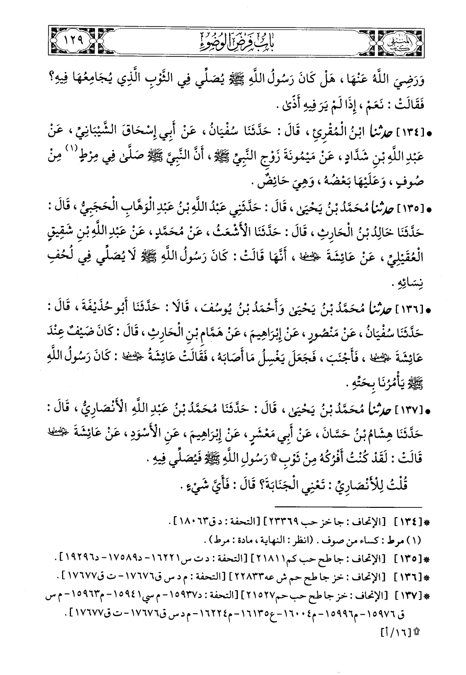 135- حَدَّثَنَا مُحَمَّدُ بْنُ يَحْيَى، قَالَ: حَدَّثَنِي عَبْدُ اللهِ بْنُ عَبْدِ الْوَهَّابِ الْحَجَبِيُّ، قَالَ: حَدَّثَنَا خَالِدُ بْنُ الْحَارِثِ، قَالَ: حَدَّثَنَا الأَشْعَثُ، عَنْ مُحَمَّدٍ، عَنْ عَبْدِ اللهِ بْنِ شَقِيقٍ الْعُقَيْلِيِّ، عَنْ عَائِشَةَ، رَضِيَ اللهُ عَنْهَا، أَنَّهَا قَالَتْ: كَانَ رَسُولُ اللهِ صَلى الله عَليه وسَلم لاَ يُصَلِّي فِي لُحُفِ نِسَائِهِ.