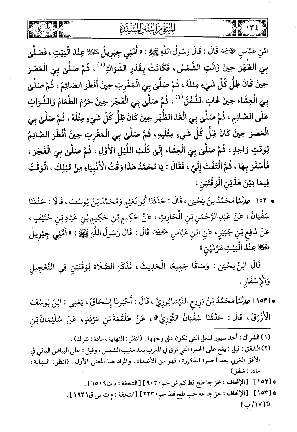 152- حَدَّثَنَا مُحَمَّدُ بْنُ يَحْيَى، قَالَ: حَدَّثَنَا أَبُو نُعَيْمٍ، وَمُحَمَّدُ بْنُ يُوسُفَ، قَالاَ: حَدَّثَنَا سُفْيَانُ، عَنْ عَبْدِ الرَّحْمَنِ بْنِ الْحَارِثِ، عَنْ حَكِيمِ بْنِ حَكِيمِ بْنِ عَبَّادِ بْنِ حُنَيْفٍ، عَنْ نَافِعِ بْنِ جُبَيْرٍ، عَنِ ابْنِ عَبَّاسٍ، رَضِيَ اللهُ عَنْهُمَا، قَالَ: قَالَ رَسُولُ اللهِ صَلى الله عَليه وسَلم: أَمَّنِي جِبْرِيلُ عَلَيْهِ السَّلاَمُ عِنْدَ الْبَيْتِ مَرَّتَيْنِ قَالَ ابْنُ يَحْيَى: وَسَاقَا جَمِيعًا الْحَدِيثَ فَذَكَرَ الصَّلاَةَ لِوَقْتَيْنِ فِي التَّعْجِيلِ وَالإِسْفَارِ.