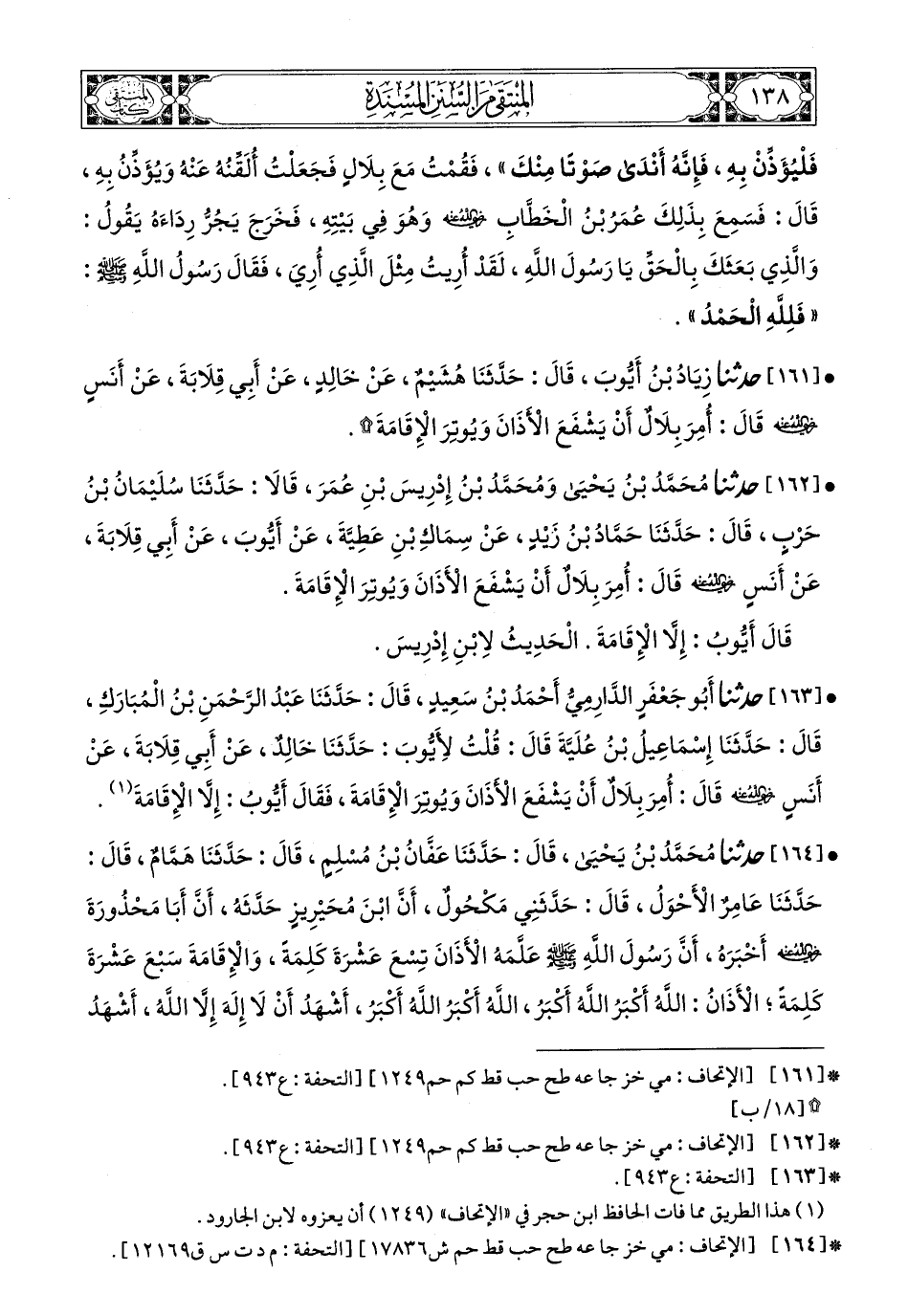 163- حَدَّثَنَا أَبُو جَعْفَرٍ الدَّارِمِيُّ أَحْمَدُ بْنُ سَعِيدٍ، قَالَ: حَدَّثَنَا عَبْدُ الرَّحْمَنِ بْنُ الْمُبَارَكِ، قَالَ: حَدَّثَنَا إِسْمَاعِيلُ ابْنُ عُلَيَّةَ، قَالَ: قُلْتُ لأَيُّوبَ: حَدَّثَنَا خَالِدٌ، عَنْ أَبِي قِلاَبَةَ، عَنْ أَنَسٍ، رَضِيَ اللهُ عَنْهُ، قَالَ: أُمِرَ بِلاَلٌ أَنْ يَشْفَعَ الأَذَانَ وَيُوتِرَ الإِقَامَةَ، فَقَالَ أَيُّوبُ: إِلاَّ الإِقَامَةَ.