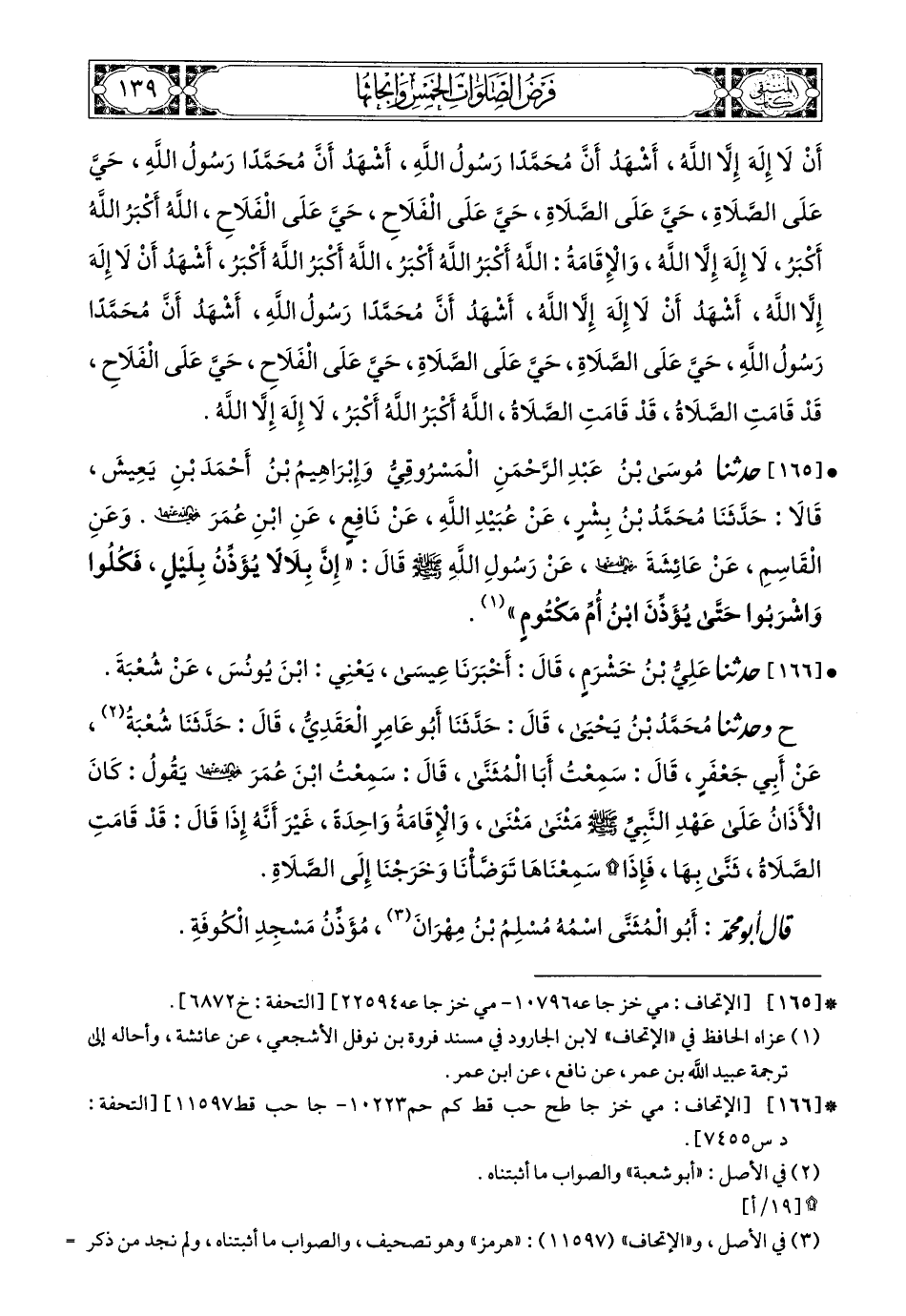 166 - حَدَّثَنَا عَلِيُّ بْنُ خَشْرَمٍ، قَالَ: أَخْبَرَنَا عِيسَى، يَعْنِي ابْنَ يُونُسَ، عَنْ شُعْبَةَ (ح) وَحَدَّثَنَا مُحَمَّدُ بْنُ يَحْيَى، قَالَ: حَدَّثَنَا أَبُو عَامِرٍ الْعَقَدِيُّ، قَالَ: حَدَّثَنَا شُعْبَةُ، عَنْ أَبِي جَعْفَرٍ، قَالَ: سَمِعْتُ أَبَا الْمُثَنَّى، قَالَ: سَمِعْتُ ابْنَ عُمَرَ، رَضِيَ اللهُ عَنْهُمَا يَقُولُ: كَانَ الأَذَانُ عَلَى عَهْدِ النَّبِيِّ صَلى الله عَليه وسَلم مَثْنَى مَثْنَى، وَالإِقَامَةُ وَاحِدَةً غَيْرَ أَنَّهُ إِذَا قَالَ: قَدْ قَامَتِ الصَّلاَةُ ثَنَّى بِهَا فَإِذَا سَمِعْنَاهَا تَوَضَّأَنَا وَخَرَجْنَا إِلَى الصَّلاَةِ.