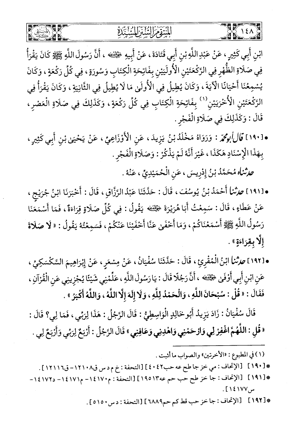 192- حَدَّثَنَا ابْنُ الْمُقْرِئِ، قَالَ: حَدَّثَنَا سُفْيَانُ، عَنْ مِسْعَرٍ، عَنْ إِبْرَاهِيمَ السَّكْسَكِيِّ، عَنِ ابْنِ أَبِي أَوْفَى، رَضِيَ اللهُ عَنْهُ، أَنَّ رَجُلاً، قَالَ: يَا رَسُولَ اللهِ عَلِّمْنِي شَيْئًا يُجْزِينِي عَنِ الْقُرْآنِ فَقَالَ: قُلْ سُبْحَانَ اللهِ وَالْحَمْدُ لِلَّهِ وَلاَ إِلَهَ إِلاَ اللهُ وَاللهُ أَكْبَرُ.