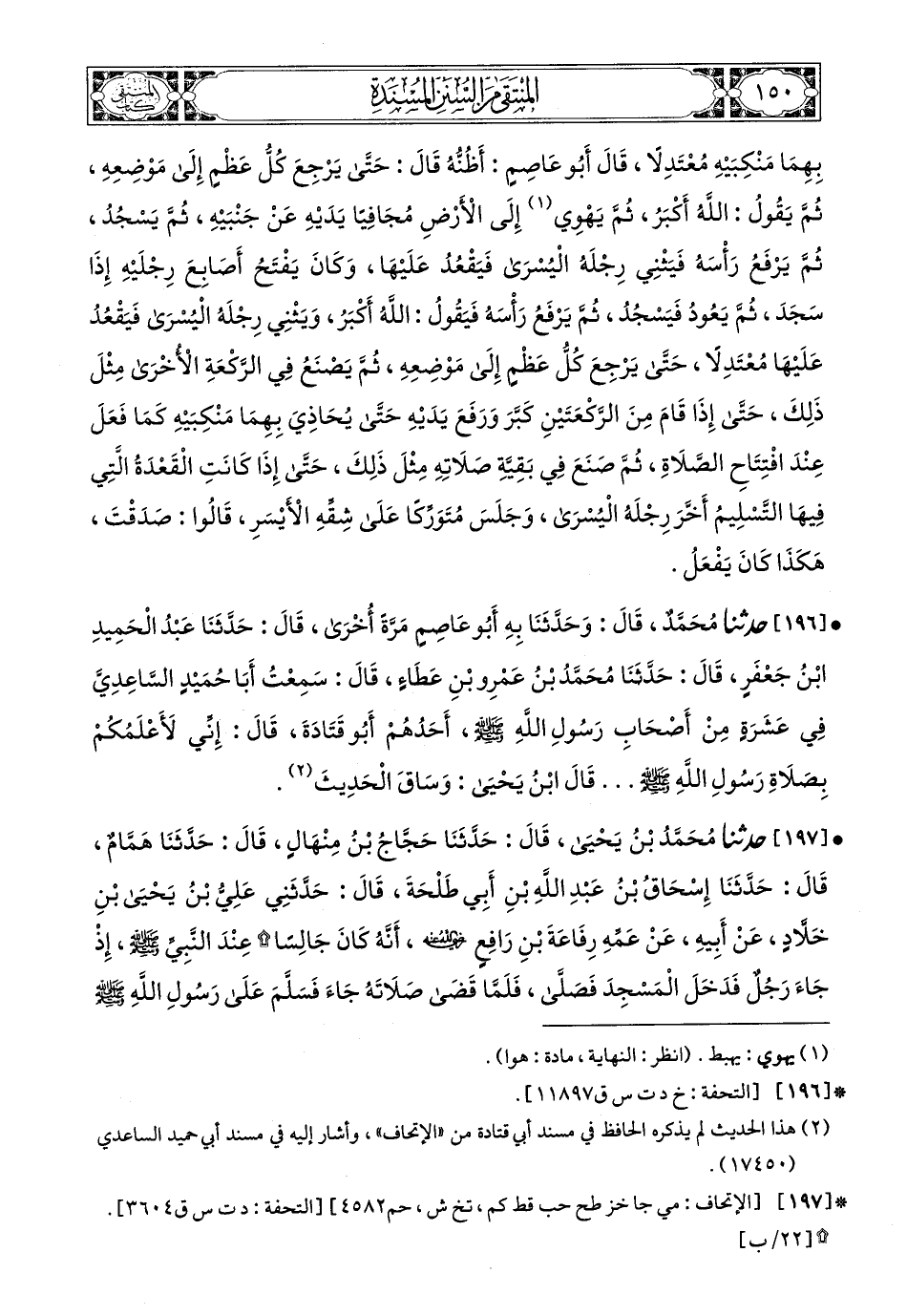 196- حَدَّثَنَا مُحَمَّدٌ، قَالَ: وحدثَنَا بِهِ أَبُو عَاصِمٍ، مَرَّةً أُخْرَى، قَالَ: حَدَّثَنَا عَبْدُ الْحَمِيدِ بْنُ جَعْفَرٍ، قَالَ: حَدَّثَنَا مُحَمَّدُ بْنُ عَمْرِو بْنِ عَطَاءٍ، قَالَ: سَمِعْتُ أَبَا حُمَيْدٍ السَّاعِدِيَّ، فِي عَشَرَةٍ مِنْ أَصْحَابِ رَسُولِ اللهِ صَلى الله عَليه وسَلم أَحَدُهُمْ أَبُو قَتَادَةَ، قَالَ: إِنِّي لأُعَلِّمُكُمْ بِصَلاَةِ رَسُولِ اللهِ صَلى الله عَليه وسَلم قَالَ ابْنُ يَحْيَى: وَسَاقَ الْحَدِيثَ.