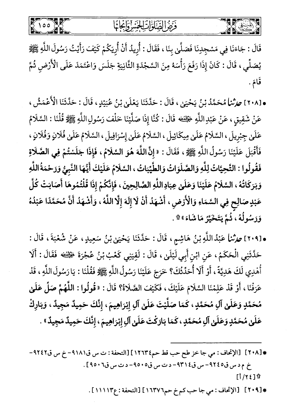 209- حَدَّثَنَا عَبْدُ اللهِ بْنُ هَاشِمٍ، قَالَ: حَدَّثَنَا يَحْيَى بْنُ سَعِيدٍ، عَنْ شُعْبَةَ، قَالَ: حَدَّثَنِي الْحَكَمُ عَنِ ابْنِ أَبِي لَيْلَى، قَالَ: لَقِيَنِي كَعْبُ بْنُ عُجْرَةَ، رَضِيَ اللهُ عَنْهُ، فَقَالَ: أَلاَ أُهْدِي لَكَ هَدِيَّةً أَوْ أَلاَ أُحَدِّثُكَ؟ خَرَجَ عَلَيْنَا رَسُولُ اللهِ صَلى الله عَليه وسَلم فَقُلْنَا: يَا رَسُولَ اللهِ قَدْ عَرَفْنَا أَوْ قَدْ عَلِمْنَا السَّلاَمَ عَلَيْكَ فَكَيْفَ الصَّلاَةُ؟ قَالَ: قُولُوا اللهُمَّ صَلِّ عَلَى مُحَمَّدٍ وَعَلَى آلِ مُحَمَّدٍ كَمَا صَلَّيْتَ عَلَى آلِ إِبْرَاهِيمَ إِنَّكَ حَمِيدٌ مَجِيدٌ وَبَارِكْ عَلَى مُحَمَّدٍ وَعَلَى آلِ مُحَمَّدٍ كَمَا بَارَكْتَ عَلَى آلِ إِبْرَاهِيمَ إِنَّكَ حَمِيدٌ مَجِيدٌ.