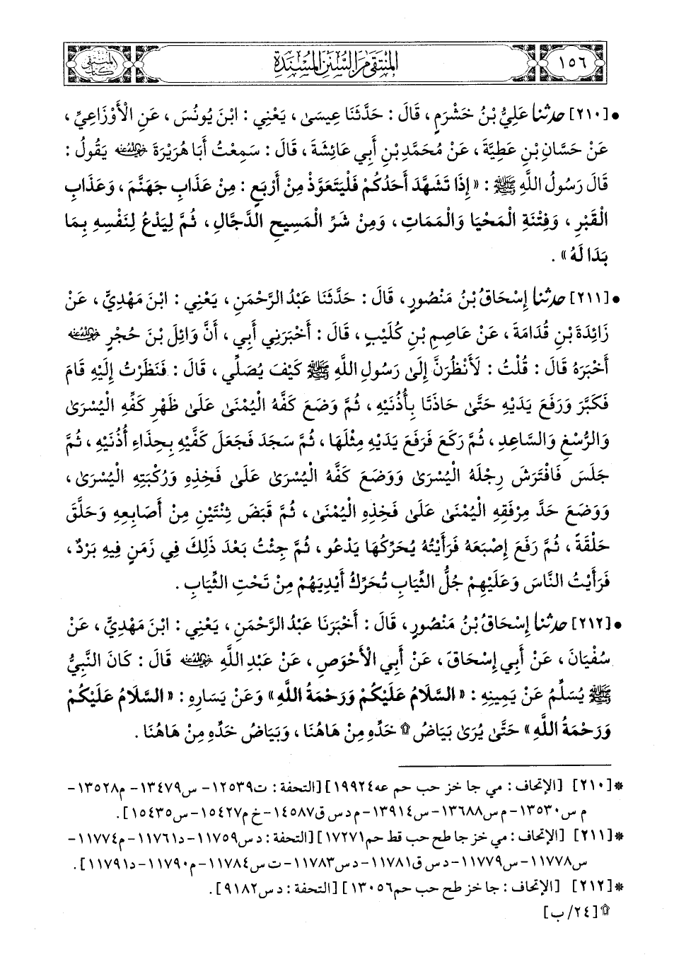 212- حَدَّثَنَا إِسْحَاقُ بْنُ مَنْصُورٍ، قَالَ: أَخْبَرَنَا عَبْدُ الرَّحْمَنِ، يَعْنِي ابْنَ مَهْدِيٍّ، عَنْ سُفْيَانَ، عَنْ أَبِي إِسْحَاقَ، عَنْ أَبِي الأَحْوَصِ، عَنْ عَبْدِ اللهِ، رَضِيَ اللهُ عَنْهُ، قَالَ: كَانَ النَّبِيُّ صَلى الله عَليه وسَلم يُسَلِّمُ عَنْ يَمِينِهِ: السَّلاَمُ عَلَيْكُمْ وَرَحْمَةُ اللهِ وَعَنْ يَسَارِهِ السَّلاَمُ عَلَيْكُمْ وَرَحْمَةُ اللهِ حَتَّى يُرَى بَيَاضُ خَدِّهِ مِنْ هَاهُنَا وَبَيَاضُ خَدِّهِ مِنْ هَاهُنَا.