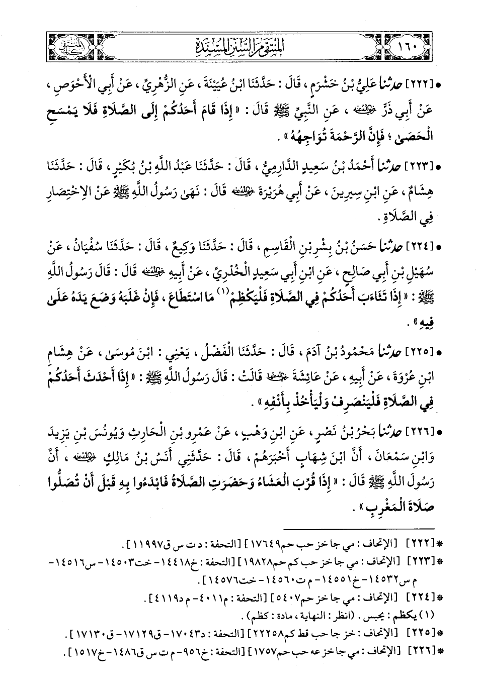 223- حَدَّثَنَا أَحْمَدُ بْنُ سَعِيدٍ الدَّارِمِيُّ، قَالَ: حَدَّثَنَا عَبْدُ اللهِ بْنُ بُكَيْرٍ، قَالَ: حَدَّثَنَا هِشَامٌ، عَنِ ابْنِ سِيرِينَ، عَنْ أَبِي هُرَيْرَةَ، رَضِيَ اللهُ عَنْهُ، قَالَ: نَهَى رَسُولُ اللهِ صَلى الله عَليه وسَلم عَنِ الاِخْتِصَارِ فِي الصَّلاَةِ.