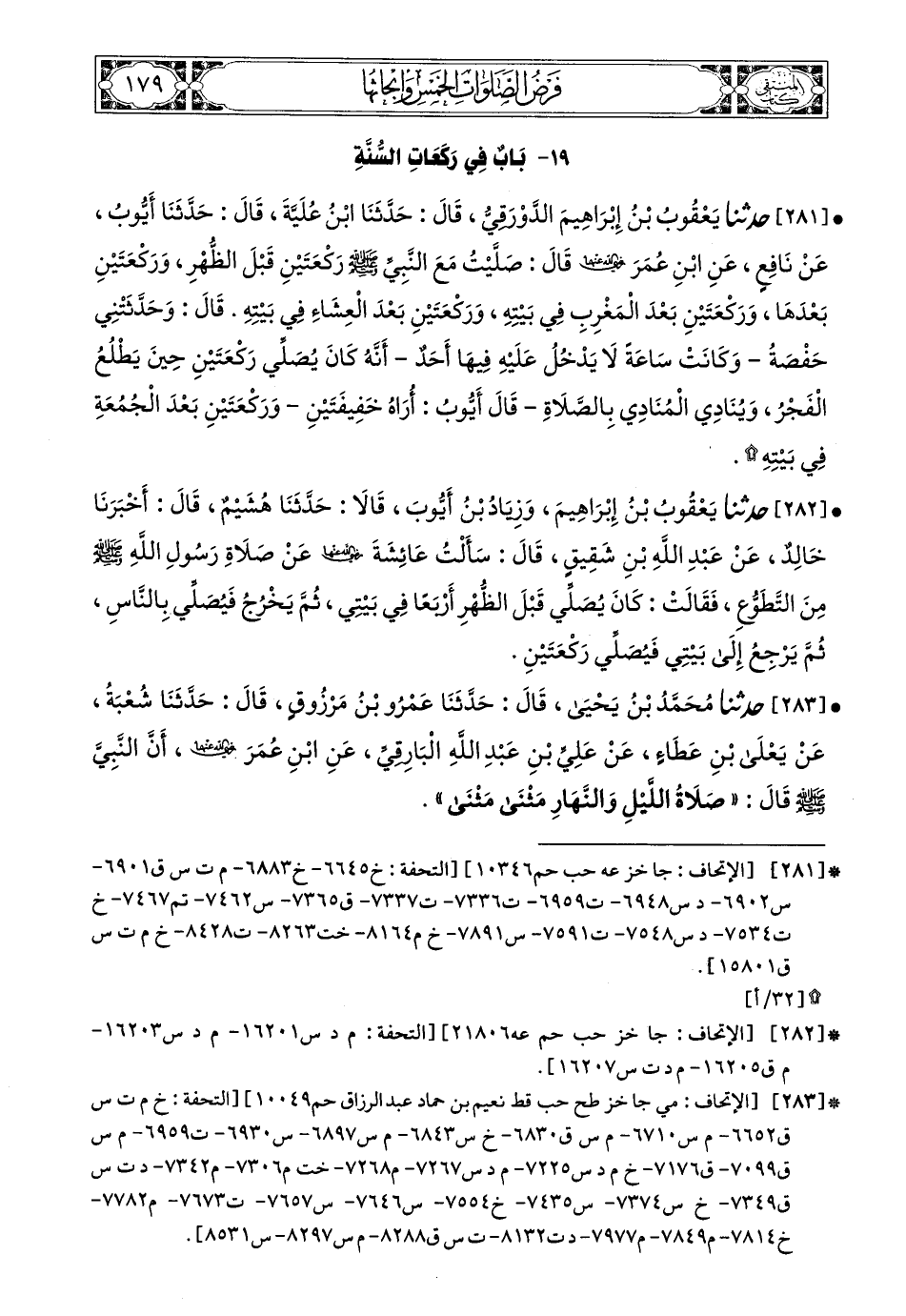 281- حَدَّثَنَا يَعْقُوبُ بْنُ إِبْرَاهِيمَ الدَّوْرَقِيُّ، قَالَ: حَدَّثَنَا ابْنُ عُلَيَّةَ، قَالَ: حَدَّثَنَا أَيُّوبُ، عَنْ نَافِعٍ، عَنِ ابْنِ عُمَرَ، رَضِيَ اللهُ عَنْهُمَا، قَالَ: صَلَّيْتُ مَعَ النَّبِيِّ صَلى الله عَليه وسَلم رَكْعَتَيْنِ قَبْلَ الظُّهْرِ وَرَكْعَتَيْنِ بَعْدَهَا وَرَكْعَتَيْنِ بَعْدَ الْمَغْرِبِ فِي بَيْتِهِ وَرَكْعَتَيْنِ بَعْدَ الْعِشَاءِ فِي بَيْتِهِ. قَالَ (1): وَحَدَّثَتْنِي حَفْصَةُ -وَكَانَتْ سَاعَةٌ لاَ يَدْخُلُ عَلَيْهِ فِيهَا أَحَدٌ- أَنَّهُ كَانَ يُصَلِّي رَكْعَتَيْنِ حِينَ يَطْلُعُ الْفَجْرُ وَيُنَادِي الْمُنَادِي بِالصَّلاَةِ -قَالَ أَيُّوبُ: أَرَاهُ خَفِيفَتَيْنِ- وَرَكْعَتَيْنِ بَعْدَ الْجُمُعَةِ فِي بَيْتِهِ.