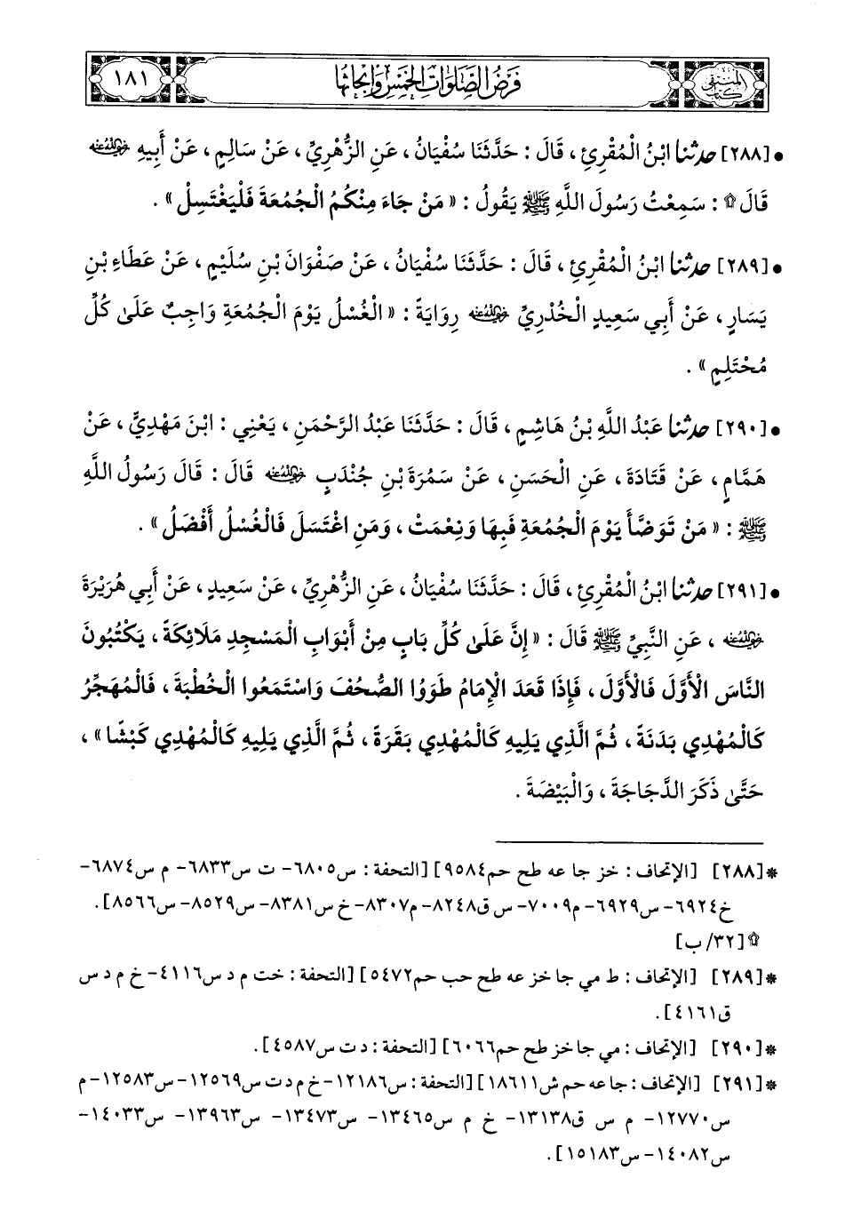 289- حَدَّثَنَا ابْنُ الْمُقْرِئِ، قَالَ: حَدَّثَنَا سُفْيَانُ، عَنْ صَفْوَانَ بْنِ سُلَيْمٍ، عَنْ عَطَاءِ بْنِ يَسَارٍ، عَنْ أَبِي سَعِيدٍ الْخُدْرِيِّ، رَضِيَ اللهُ عَنْهُ، رِوَايَةً: الْغُسْلُ يَوْمَ الْجُمُعَةِ وَاجِبٌ عَلَى كُلِّ مُحْتَلِمٍ.