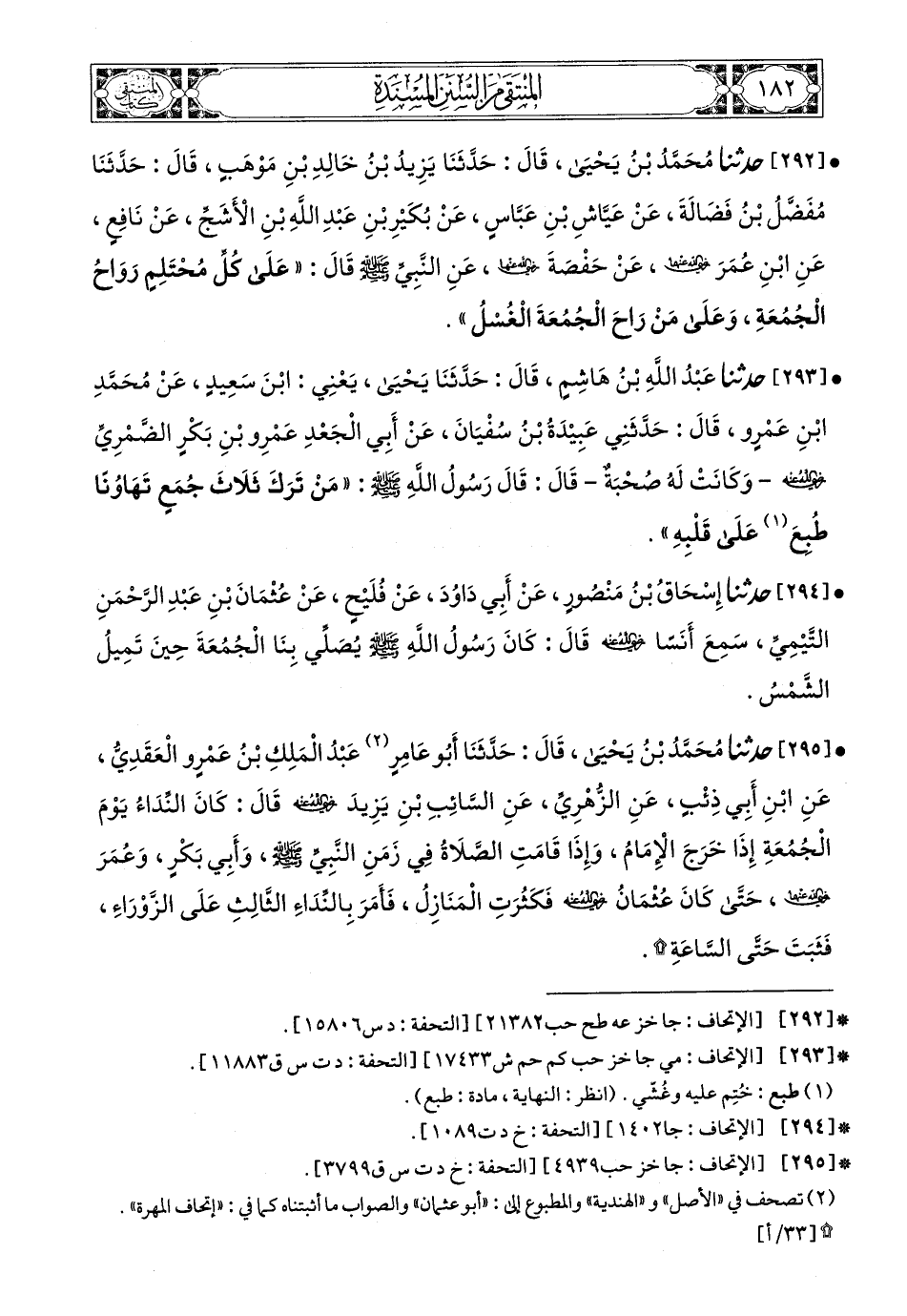292- حَدَّثَنَا مُحَمَّدُ بْنُ يَحْيَى، قَالَ: حَدَّثَنَا يَزِيدُ بْنُ خَالِدِ بْنِ مَوْهَبٍ، قَالَ: حَدَّثَنَا مُفَضَّلُ بْنُ فَضَالَةَ، عَنْ عَيَّاشِ بْنِ عَبَّاسٍ، عَنْ بُكَيْرِ بْنِ عَبْدِ اللهِ بْنِ الأَشَجِّ، عَنْ نَافِعٍ، عَنِ ابْنِ عُمَرَ، رَضِيَ اللهُ عَنْهُمَا، عَنْ حَفْصَةَ، رَضِيَ اللهُ عَنْهَا، عَنِ النَّبِيِّ صَلى الله عَليه وسَلم قَالَ: عَلَى كُلِّ مُحْتَلِمٍ رَوَاحُ الْجُمُعَةِ وَعَلَى مَنْ رَاحَ الْجُمُعَةَ الْغُسْلُ.