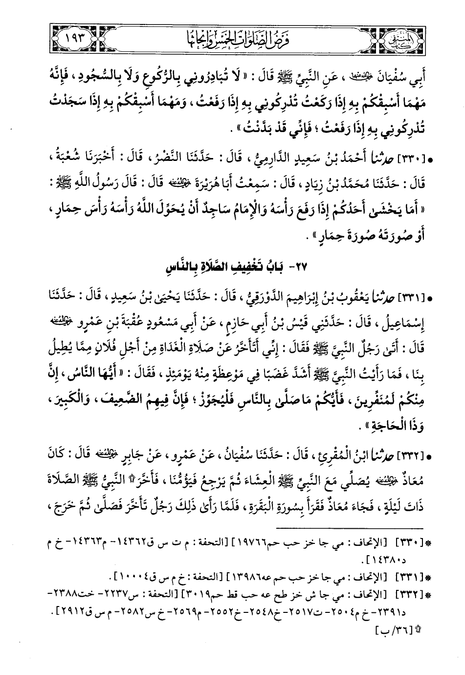 330- حَدَّثَنَا أَحْمَدُ بْنُ سَعِيدٍ الدَّارِمِيُّ، قَالَ: حَدَّثَنَا النَّضْرُ، قَالَ: أَخْبَرَنَا شُعْبَةُ، قَالَ: حَدَّثَنَا مُحَمَّدُ بْنُ زِيَادٍ، قَالَ: سَمِعْتُ أَبَا هُرَيْرَةَ، رَضِيَ اللهُ عَنْهُ، قَالَ رَسُولُ اللهِ صَلى الله عَليه وسَلم: أَمَا يَخْشَى أَحَدُكُمْ إِذَا رَفَعَ رَأْسَهُ وَالإِمَامُ سَاجِدٌ أَنْ يُحَوِّلَ اللهُ رَأْسَهُ رَأْسَ حِمَارٍ أَوْ صُورَتَهُ صُورَةَ حِمَارٍ؟.