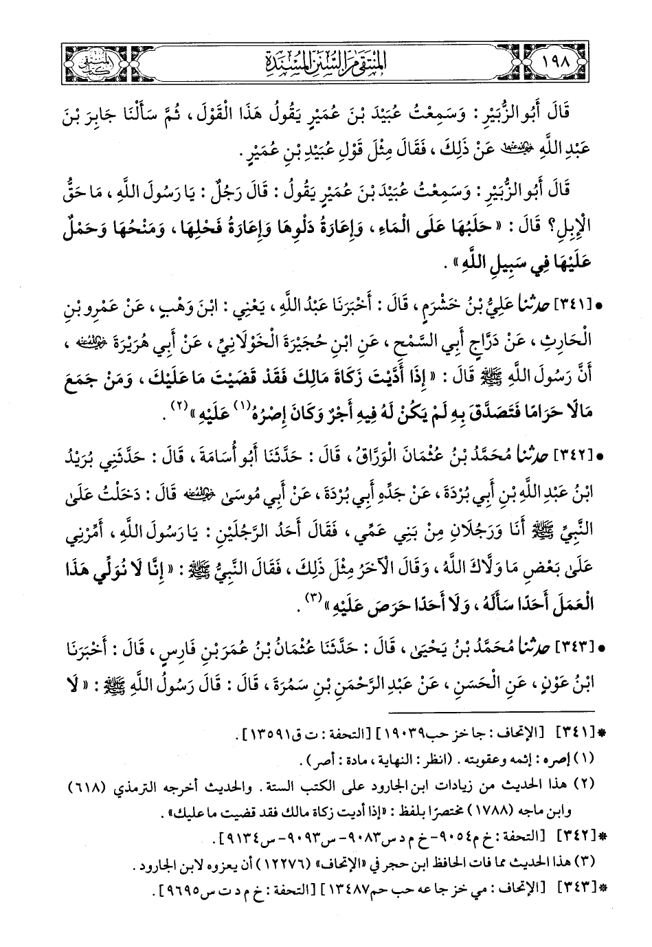 341- حَدَّثَنَا عَلِيُّ بْنُ خَشْرَمٍ، قَالَ: أَخْبَرَنَا عَبْدُ اللهِ، يَعْنِي ابْنَ وَهْبٍ، عَنْ عَمْرِو بْنِ الْحَارِثِ، عَنْ دَرَّاجٍ أَبِي السَّمْحِ، عَنِ ابْنِ حُجَيْرَةَ الْخَوْلاَنِيِّ، عَنْ أَبِي هُرَيْرَةَ، رَضِيَ اللهُ عَنْهُ، أَنَّ رَسُولَ اللهِ صَلى الله عَليه وسَلم قَالَ: إِذَا أَدَّيْتَ زَكَاةَ مَالِكَ فَقَدْ قَضَيْتَ مَا عَلَيْكَ وَمَنْ جَمَعَ مَالاً حَرَامًا فَتَصَدَّقَ بِهِ لَمْ يَكُنْ لَهُ فِيهِ أَجْرٌ وَكَانَ إِصْرُهُ عَلَيْهِ.