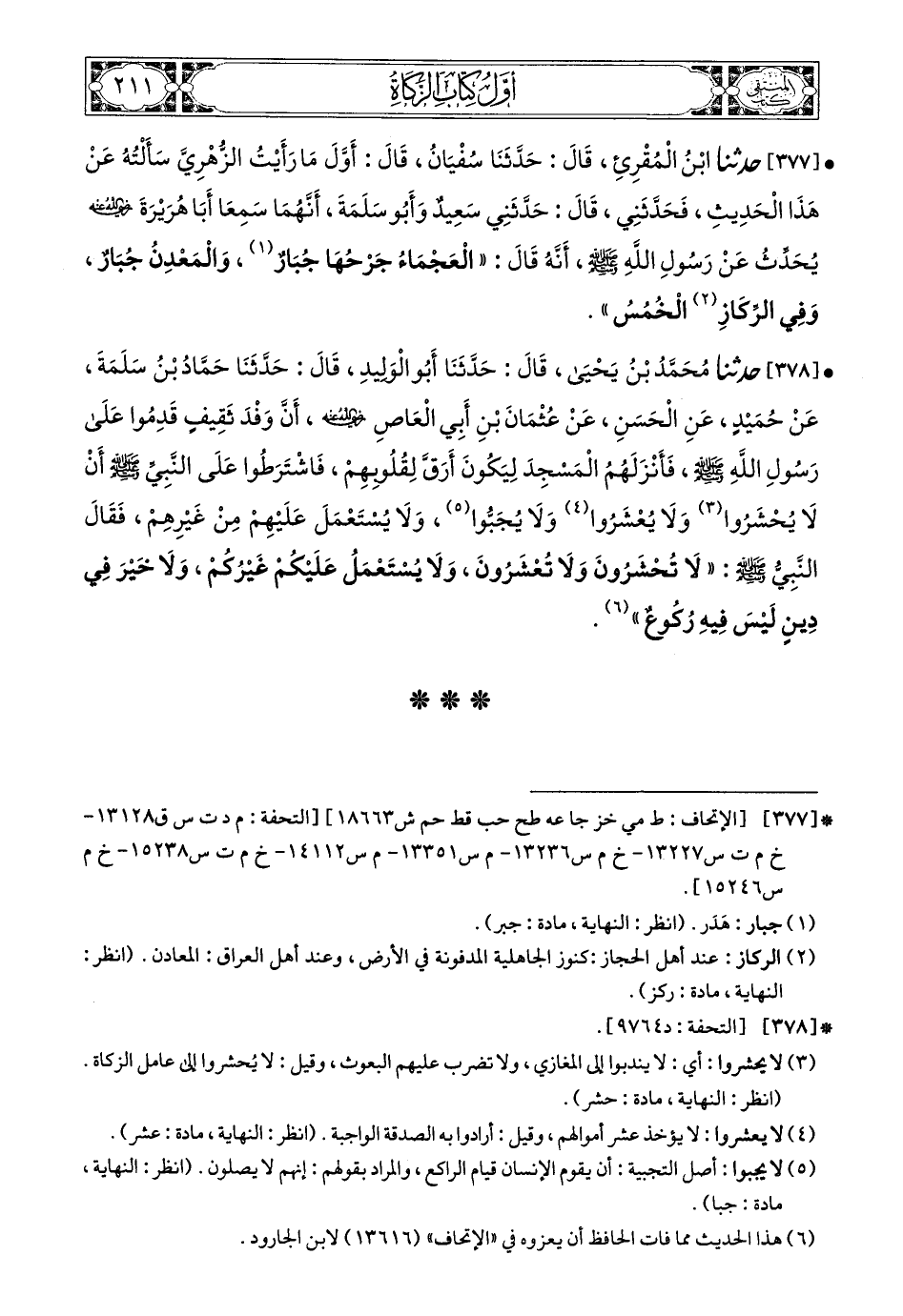 377- حَدَّثَنَا ابْنُ الْمُقْرِئِ، قَالَ: حَدَّثَنَا سُفْيَانُ، قَالَ: أَوَّلُ مَا رَأَيْتُ الزُّهْرِيَّ سَأَلْتُهُ عَنْ هَذَا الْحَدِيثِ فَحَدَّثَنِي، قَالَ: حَدَّثَنِي سَعِيدٌ وَأَبُو سَلَمَةَ أَنَّهُمَا سَمِعَا أَبَا هُرَيْرَةَ، رَضِيَ اللهُ عَنْهُ، يُحَدِّثُ عَنْ رَسُولِ اللهِ صَلى الله عَليه وسَلم أَنَّهُ قَالَ: الْعَجْمَاءُ جَرْحُهَا جُبَارٌ وَالْمَعْدِنُ جُبَارٌ وَفِي الرِّكَازِ الْخُمُسُ.