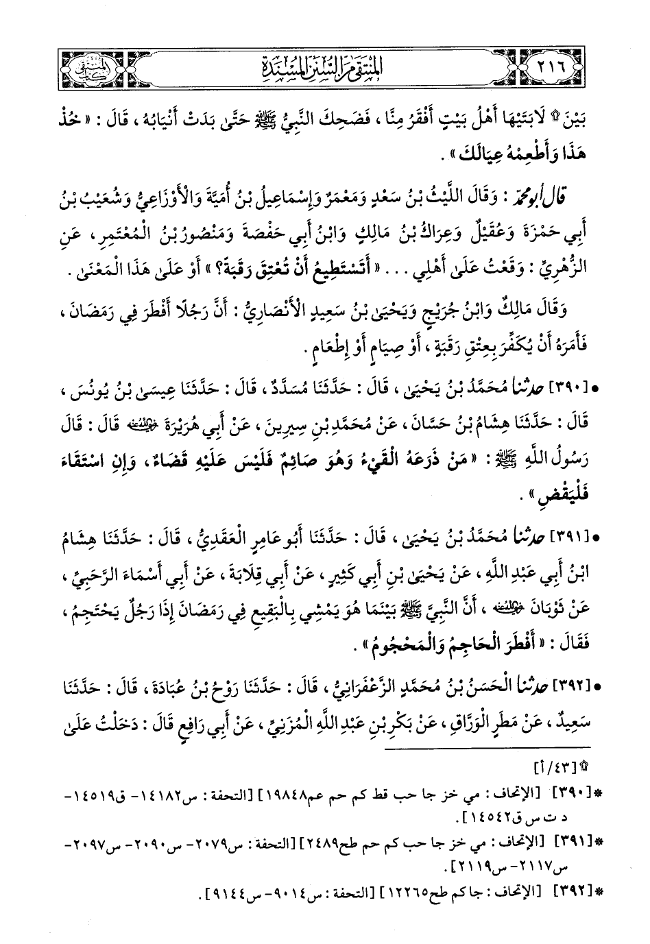 391- حَدَّثَنَا مُحَمَّدُ بْنُ يَحْيَى، قَالَ: حَدَّثَنَا أَبُو عَامِرٍ الْعَقَدِيُّ، قَالَ: حَدَّثَنَا هِشَامُ بْنُ أَبِي عَبْدِ اللهِ، عَنْ يَحْيَى بْنِ أَبِي كَثِيرٍ، عَنْ أَبِي قِلاَبَةَ، عَنْ أَبِي أَسْمَاءَ الرَّحَبِيِّ، عَنْ ثَوْبَانَ، رَضِيَ اللهُ عَنْهُ، أَنَّ النَّبِيَّ صَلى الله عَليه وسَلم بَيْنَمَا هُوَ يَمْشِي بِالْبَقِيعِ فِي رَمَضَانَ إِذَا رَجُلٌ يَحْتَجِمُ فَقَالَ: أَفْطَرَ الْحَاجِمُ وَالْمَحْجُومُ.