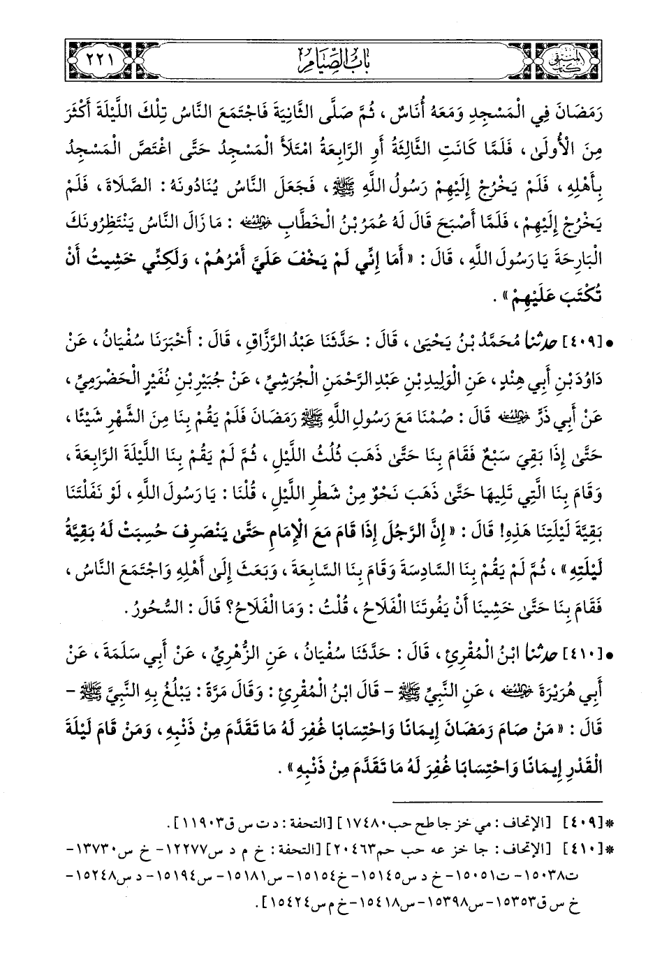409- حَدَّثَنَا مُحَمَّدُ بْنُ يَحْيَى، قَالَ: حَدَّثَنَا عَبْدُ الرَّزَّاقِ، قَالَ: أَخْبَرَنَا سُفْيَانُ، عَنْ دَاوُدَ بْنِ أَبِي هِنْدٍ، عَنِ الْوَلِيدِ بْنِ عَبْدِ الرَّحْمَنِ الْجُرَشِيِّ، عَنْ جُبَيْرِ بْنِ نُفَيْرٍ الْحَضْرَمِيِّ، عَنْ أَبِي ذَرٍّ، رَضِيَ اللهُ عَنْهُ، قَالَ: صُمْنَا مَعَ رَسُولِ اللهِ صَلى الله عَليه وسَلم رَمَضَانَ فَلَمْ يَقُمْ بِنَا مِنَ الشَّهْرِ شَيْئًا، حَتَّى إِذَا بَقِيَ سَبْعٌ فَقَامَ بِنَا حَتَّى ذَهَبَ ثُلُثُ اللَّيْلِ، ثُمَّ لَمْ يَقُمْ بِنَا اللَّيْلَةَ الرَّابِعَةَ وَقَامَ بِنَا الَّتِي تَلِيهَا حَتَّى ذَهَبَ نَحْوٌ مِنْ شَطْرِ اللَّيْلِ، قُلْنَا: يَا رَسُولَ اللهِ لَوْ نَفَلْتَنَا بَقِيَّةَ لَيْلَتَنَا هَذِهِ، قَالَ: إِنَّ الرَّجُلَ إِذَا قَامَ مَعَ الإِمَامِ حَتَّى يَنْصَرِفَ حُسِبَتْ لَهُ بَقِيَّةُ لَيْلَتِهِ، ثُمَّ لَمْ يَقُمْ بِنَا السَّادِسَةَ وَقَامَ بِنَا السَّابِعَةَ وَبَعَثَ إِلَى أَهْلِهِ وَاجْتَمَعَ النَّاسُ فَقَامَ بِنَا حَتَّى خَشِينَا أَنْ يَفُوتَنَا الْفَلاَحُ، قُلْتُ: وَمَا الْفَلاَحُ؟ قَالَ: السُّحُورُ.