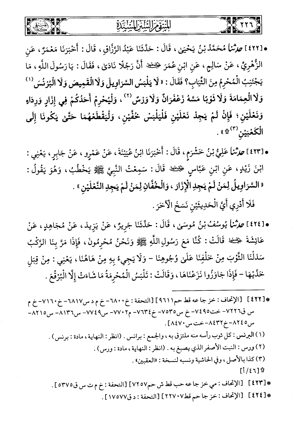 422- حَدَّثَنَا مُحَمَّدُ بْنُ يَحْيَى، قَالَ: حَدَّثَنَا عَبْدُ الرَّزَّاقِ، قَالَ: أَخْبَرَنَا مَعْمَرٌ، عَنِ الزُّهْرِيِّ، عَنْ سَالِمٍ، عَنِ ابْنِ عُمَرَ، رَضِيَ اللهُ عَنْهُمَا، أَنَّ رَجُلاً نَادَى فَقَالَ: يَا رَسُولَ اللهِ مَا يَجْتَنِبُ الْمُحْرِمُ مِنَ الثِّيَابِ؟ فَقَالَ: لاَ يَلْبَسُ السَّرَاوِيلَ، وَلاَ الْقَمِيصَ، وَلاَ البُرْنُسَ، وَلاَ الْعِمَامَةَ، وَلاَ ثَوْبًا مَسَّهُ زَعْفَرَانٌ، وَلاَ وَرْسٌ، وَلْيُحْرِمْ أَحَدُكُمْ فِي إِزَارٍ، وَرِدَاءٍ، وَنَعْلَيْنِ، فَإِنْ لَمْ يَجِدْ نَعْلَيْنِ فَلْيَلْبَسْ خُفَّيْنِ، وَلْيَقْطَعْهُمَا حَتَّى يَكُونَا إِلَى الْكَعْبَيْنِ.