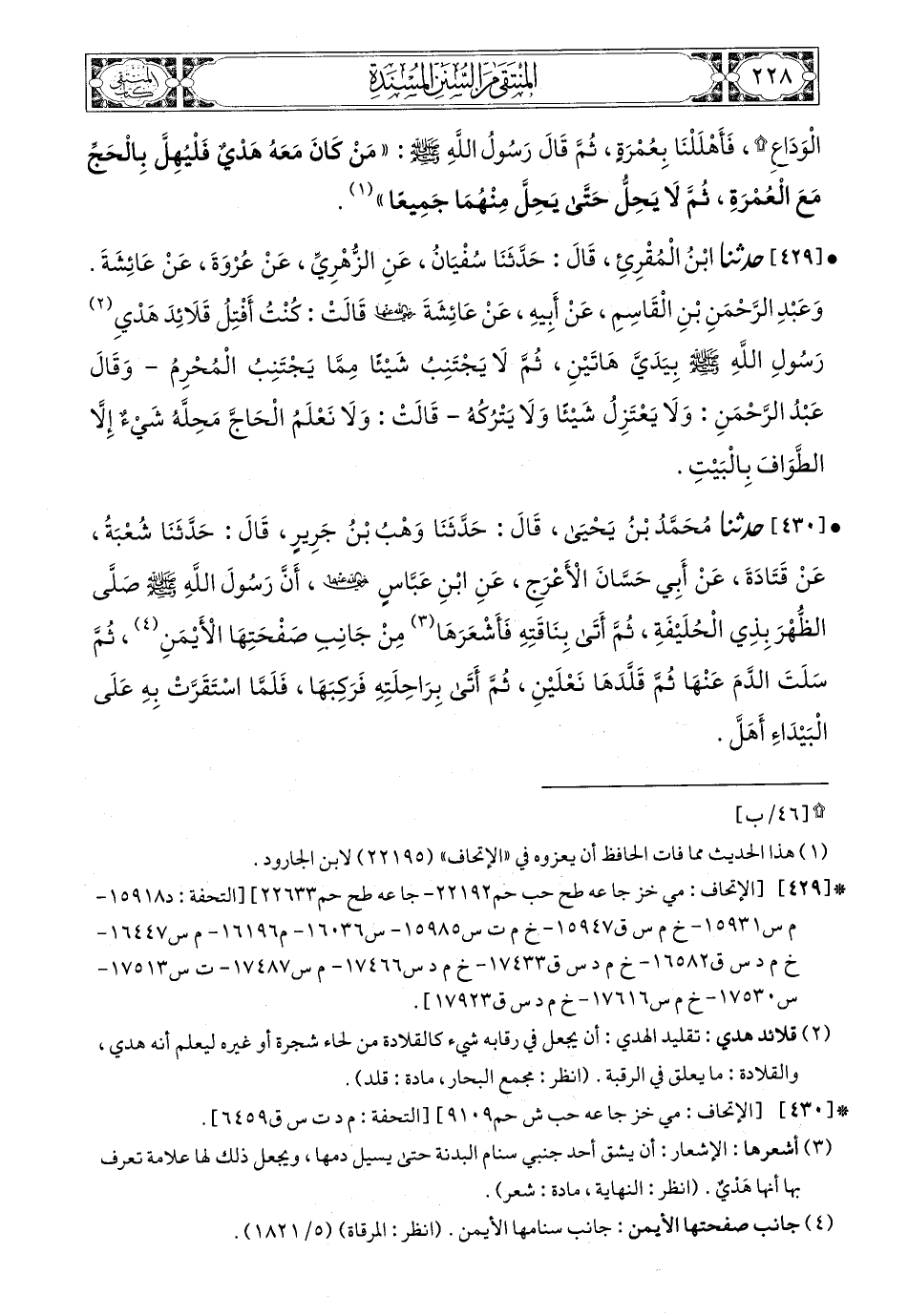 430- حَدَّثَنَا مُحَمَّدُ بْنُ يَحْيَى، قَالَ: حَدَّثَنَا وَهْبُ بْنُ جَرِيرٍ، قَالَ: حَدَّثَنَا شُعْبَةُ، عَنْ قَتَادَةَ، عَنْ أَبِي حَسَّانَ الأَعْرَجِ، عَنِ ابْنِ عَبَّاسٍ، رَضِيَ اللهُ عَنْهُمَا أَنَّ رَسُولَ اللهِ صَلى الله عَليه وسَلم صَلَّى الظُّهْرَ بِذِي الْحُلَيْفَةِ، ثُمَّ أَتَى بِنَاقَتِهِ فَأَشْعَرَهَا مِنْ جَانِبِ صَفْحَتِهَا الأَيْمَنِ، ثُمَّ سَلَتِ الدَّمَ عَنْهَا، ثُمَّ قَلَّدَهَا نَعْلَيْنِ، ثُمَّ أَتَى بِرَاحِلَتِهِ فَرَكِبَهَا فَلَمَّا اسْتَقَرَّتْ بِهِ عَلَى الْبَيْدَاءِ أَهَلَّ.