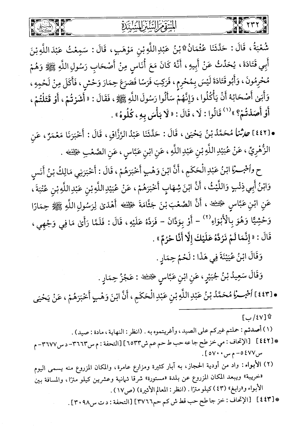 442- حَدَّثَنَا مُحَمَّدُ بْنُ يَحْيَى، قَالَ: حَدَّثَنَا عَبْدُ الرَّزَّاقِ، قَالَ: أَخْبَرَنَا مَعْمَرٌ، عَنِ الزُّهْرِيِّ، عَنْ عُبَيْدِ اللهِ بْنِ عَبْدِ اللهِ، عَنِ ابْنِ عَبَّاسٍ، عَنِ الصَّعْبِ، رَضِيَ اللهُ عَنْهُ (ح) وَأَخْبَرَنَا ابْنُ عَبْدِ الْحَكَمِ، أَنَّ ابْنَ وَهْبٍ أَخْبَرَهُمْ، قَالَ: أَخْبَرَنِي مَالِكُ بْنُ أَنَسٍ، وَابْنُ أَبِي ذِئْبٍ، وَاللَّيْثُ، أَنَّ ابْنَ شِهَابٍ أَخْبَرَهُمْ، عَنْ عُبَيْدِ اللهِ بْنِ عَبْدِ اللهِ بْنِ عُتْبَةَ، عَنِ ابْنِ عَبَّاسٍ، رَضِيَ اللهُ عَنْهُمَا أَنَّ الصَّعْبَ بْنَ جَثَّامَةَ، رَضِيَ اللهُ عَنْهُ، أَهْدَى لِرَسُولِ اللهِ صَلى الله عَليه وسَلم حِمَارًا وَحْشِيًّا وَهُوَ بِالأَبْوَاءِ أَوْ بِوَدَّانَ فَرَدَّهُ عَلَيْهِ قَالَ فَلَمَّا رَأَى مَا فِي وَجْهِي قَالَ: إِنَّمَا لَمْ نَرُدَّهُ عَلَيْكَ إِلاَّ أَنَّا حُرُمٌ.