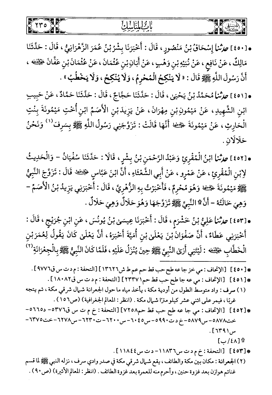 451- حَدَّثَنَا مُحَمَّدُ بْنُ يَحْيَى، قَالَ: حَدَّثَنَا حَجَّاجٌ، قَالَ: حَدَّثَنَا حَمَّادٌ، عَنْ حَبِيبِ بْنِ الشَّهِيدِ، عَنْ مَيْمُونِ بْنِ مِهْرَانَ، عَنْ يَزِيدَ بْنِ الأَصَمِّ ابْنِ أُخْتِ مَيْمُونَةَ بِنْتِ الْحَارِثِ، عَنْ مَيْمُونَةَ، رَضِيَ اللهُ عَنْهَا، قَالَتْ: تَزَوَّجَنِي رَسُولُ اللهِ صَلى الله عَليه وسَلم بِسَرِفَ وَنَحْنُ حَلاَلاَنِ.