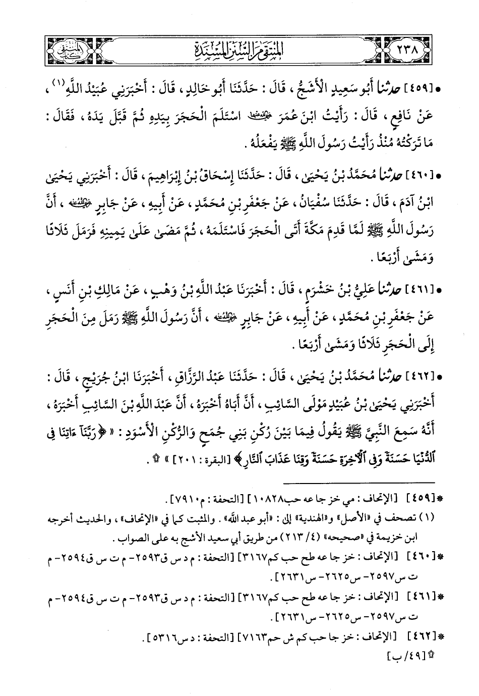 459- حَدَّثَنَا أَبُو سَعِيدٍ الأَشَجُّ، قَالَ: حَدَّثَنَا أَبُو خَالِدٍ، قَالَ: أَخْبَرَنِي عُبَيْدُ اللهِ، عَنْ نَافِعٍ، قَالَ: رَأَيْتُ ابْنَ عُمَرَ، رَضِيَ اللهُ عَنْهُمَا اسْتَلَمَ الْحَجَرَ بِيَدِهِ، ثُمَّ قَبَّلَ يَدَهُ، فَقَالَ: مَا تَرَكْتُهُ مُنْذُ رَأَيْتُ رَسُولَ اللهِ صَلى الله عَليه وسَلم يَفْعَلُهُ.