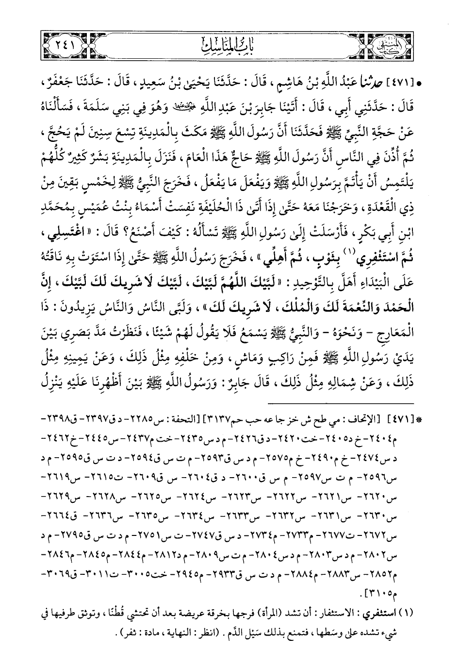 471- حَدَّثَنَا عَبْدُ اللهِ بْنُ هَاشِمٍ، قَالَ: حَدَّثَنَا يَحْيَى بْنُ سَعِيدٍ، قَالَ: حَدَّثَنَا جَعْفَرٌ، قَالَ: حَدَّثَنِي أَبِي قَالَ: أَتَيْنَا جَابِرَ بْنَ عَبْدِ اللهِ، رَضِيَ اللهُ عَنْهُمَا وَهُوَ فِي بَنِي سَلَمَةَ فَسَأَلْنَاهُ عَنْ حَجَّةِ النَّبِيِّ صَلى الله عَليه وسَلم فَحَدَّثَنَا أَنَّ رَسُولَ اللهِ صَلى الله عَليه وسَلم مَكَثَ بِالْمَدِينَةِ تِسْعَ سِنِينَ لَمْ يَحُجَّ، ثُمَّ أُذِّنَ فِي النَّاسِ أَنَّ رَسُولَ اللهِ صَلى الله عَليه وسَلم حَاجٌّ هَذَا الْعَامَ، فَنَزَلَ بِالْمَدِينَةِ بِشَرٌ كَثِيرٌ كُلُّهُمْ يَلْتَمِسُ أَنْ يَأْتَمَّ بِرَسُولِ اللهِ صَلى الله عَليه وسَلم وَيَفْعَلَ مَا يَفْعَلُ، فَخَرَجَ النَّبِيُّ صَلى الله عَليه وسَلم لِخَمْسٍ بَقِينَ مِنْ ذِي الْقَعْدَةِ وَخَرَجْنَا مَعَهُ، حَتَّى إِذَا أَتَى ذَا الْحُلَيْفَةِ نَفِسَتْ أَسْمَاءُ بِنْتُ عُمَيْسٍ بِمُحَمَّدِ بْنِ أَبِي بَكْرٍ، فَأَرْسَلَتْ إِلَى رَسُولِ اللهِ صَلى الله عَليه وسَلم تَسْأَلُهُ كَيْفَ أَصْنَعُ؟ قَالَ: اغْتَسِلِي، ثُمَّ اسْتَثْفِرِي بِثَوْبٍ، ثُمَّ أَهِلِّي، فَخَرَجَ رَسُولُ اللهِ حَتَّى إِذَا اسْتَوَتْ بِهِ نَاقَتُهُ عَلَى الْبَيْدَاءِ أَهَلَّ بِالتَّوْحِيدِ: لَبَّيْكَ اللهُمَّ لَبَّيْكَ لَبَّيْكَ لاَ شَرِيكَ لَكَ لَبَّيْكَ إِنَّ الْحَمْدَ وَالنِّعْمَةَ لَكَ وَالْمُلْكَ لاَ شَرِيكَ لَكَ، وَلَبَّى النَّاسُ وَالنَّاسُ يَزِيدُونَ ذَا الْمَعَارِجِ وَنَحْوَهُ، وَالنَّبِيُّ صَلى الله عَليه وسَلم يَسْمَعُ فَلاَ يَقُولُ لَهُمْ شَيْئًا، فَنَظَرْتُ مَدَّ بَصَرِي بَيْنَ يَدَيْ رَسُولِ اللهِ صَلى الله عَليه وسَلم فَمِنْ رَاكِبٍ وَمَاشٍ وَمِنْ خَلْفِهِ مِثْلُ ذَلِكَ وَعَنْ يَمِينِهِ مِثْلُ ذَلِكَ وَعَنْ شِمَالِهِ مِثْلُ ذَلِكَ، قَالَ جَابِرٌ: وَرَسُولُ اللهِ صَلى الله عَليه وسَلم بَيْنَ أَظْهُرِنَا عَلَيْهِ يَنْزِلُ الْقُرْآنُ وَهُوَ يُعْرَفُ تَأْوِيلَهُ فَمَا عَمِلَ بِهِ مِنْ شَيْءٍ عَمِلْنَا، فَخَرَجْنَا لاَ نَنْوِي إِلاَّ الْحَجَّ حَتَّى إِذَا أَتَيْنَا الْكَعْبَةَ اسْتَلَمَ نَبِيُّ اللهِ صَلى الله عَليه وسَلم الْحَجَرَ الأَسْوَدَ، ثُمَّ رَمَلَ ثَلاَثَةً وَمَشَى أَرْبَعَةً، حَتَّى إِذَا فَرَغَ عَمَدَ إِلَى مَقَامِ إِبْرَاهِيمَ صَلى الله عَليه وسَلم فَصَلَّى خَلْفَهُ رَكْعَتَيْنِ، ثُمَّ قَرَأَ {وَاتَّخِذُوا مِنْ مَقَامِ إِبْرَاهِيمَ مُصَلَّى} [البقرة 125] قَالَ أَبِي: فَقَرَأَ فِيهِ بِالتَّوْحِيدِ، وَ {قُلْ يَا أَيُّهَا الْكَافِرُونَ}، ثُمَّ اسْتَلَمَ الْحَجَرَ وَخَرَجَ إِلَى الصَّفَا، ثُمَّ قَرَأَ {إِنَّ الصَّفَا وَالْمَرْوَةَ مِنْ شَعَائِرِ اللَّهِ} [البقرة 158] ثُمَّ قَالَ: نَبْدَأُ بِمَا بَدَأَ اللهُ بِهِ فَرَقَيَ عَلَى الصَّفَا حَتَّى إِذَا نَظَرَ إِلَى الْبَيْتِ كَبَّرَ، ثُمَّ قَالَ: لاَ إِلَهَ إِلاَّ اللهُ وَحْدَهُ لاَ شَرِيكَ لَهُ لَهُ الْمُلْكُ وَلَهُ الْحَمْدُ وَهُوَ عَلَى كُلِّ شَيْءٍ قَدِيرٌ، لاَ إِلَهَ إِلاَّ اللهُ أَنْجَزَ وَعْدَهُ وَنَصَرَ عَبْدَهُ وَهَزَمَ- أَوْ غَلَبَ- الأَحْزَابَ وَحْدَهُ،