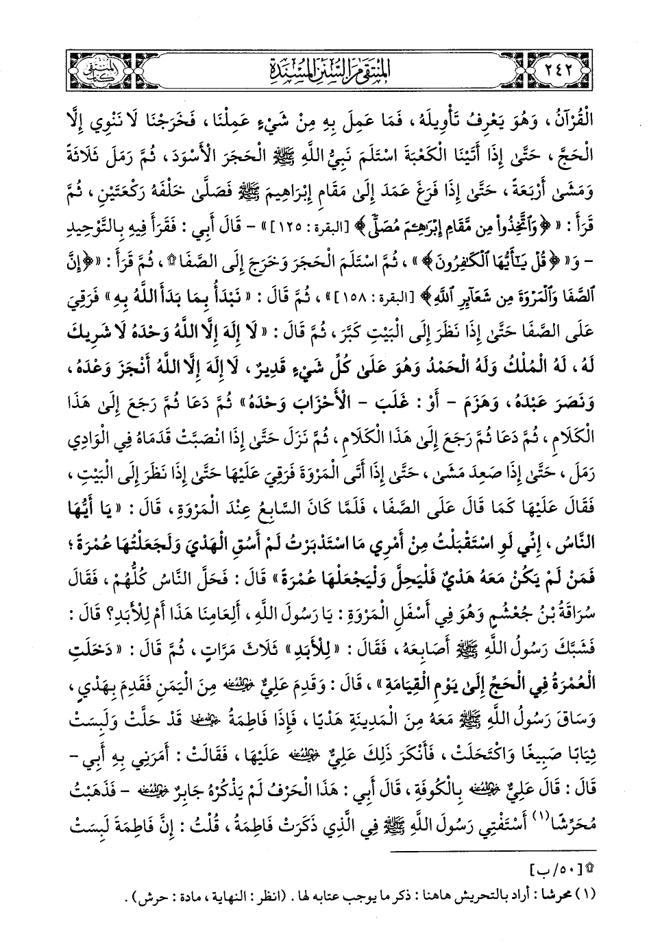 ثُمَّ دَعَا، ثُمَّ رَجَعَ إِلَى هَذَا الْكَلاَمِ، ثُمَّ دَعَا، ثُمَّ رَجَعَ إِلَى هَذَا الْكَلاَمِ، ثُمَّ نَزَلَ حَتَّى إِذَا انْصَبَّتْ قَدَمَاهُ فِي الْوَادِي رَمَلَ حَتَّى إِذَا صَعِدَ مَشَى حَتَّى إِذَا أَتَى الْمَرْوَةَ فَرَقِيَ عَلَيْهَا حَتَّى إِذَا نَظَرَ إِلَى الْبَيْتِ فَقَالَ عَلَيْهَا كَمَا قَالَ عَلَى الصَّفَا فَلَمَّا كَانَ السَّابِعُ عِنْدَ الْمَرْوَةِ قَالَ: يَا أَيُّهَا النَّاسُ إِنِّي لَوِ اسْتَقْبَلْتُ مِنْ أَمْرِي مَا اسْتَدْبَرْتُ لَمْ أَسُقِ الْهَدْيَ وَلَجَعَلْتُهَا عُمْرَةً، فَمَنْ لَمْ يَكُنْ مَعَهُ هَدْيٌ فَلْيَحِلَّ وَلْيَجْعَلْهَا عُمْرَةً، قَالَ: فَحَلَّ النَّاسُ كُلُّهُمْ، فَقَالَ سُرَاقَةُ بْنُ جُعْشُمٍ وَهُوَ فِي أَسْفَلِ الْمَرْوَةِ: يَا رَسُولَ اللهِ أَلِعَامِنَا هَذَا أَمْ لِلأَبَدِ؟ قَالَ: فَشَبَّكَ رَسُولُ اللهِ صَلى الله عَليه وسَلم أَصَابِعَهُ فقَالَ: لِلأَبَدِ ثَلاَثَ مَرَّاتٍ، ثُمَّ قَالَ: دَخَلَتِ الْعُمْرَةُ فِي الْحَجِّ إِلَى الْقِيَامَةِ، قَالَ: وَقَدِمَ عَلِيُّ، رَضِيَ اللهُ عَنْهُ، مِنَ الْيَمَنِ فَقَدِمَ بِهَدْيٍ وَسَاقَ رَسُولُ اللهِ صَلى الله عَليه وسَلم مَعَهُ مِنَ الْمَدِينَةِ هَدْيًا، فَإِذَا فَاطِمَةُ، رَضِيَ اللهُ عَنْهَا، قَدْ حَلَّتْ وَلَبِسَتْ ثِيَابًا صَبِيغًا وَاكْتَحَلَتْ فَأَنْكَرَ ذَلِكَ عَلِيُّ، رَضِيَ اللهُ عَنْهُ عَلَيْهَا، فَقَالَتْ: أَمَرَنِي بِهِ أَبِي- قَالَ: قَالَ عَلِيُّ، رَضِيَ اللهُ عَنْهُ، بِالْكُوفَةِ، قَالَ أَبِي هَذَا الْحَرْفُ لَمْ يَذْكُرْهُ جَابِرٌ، رَضِيَ اللهُ عَنْهُ- فَذَهَبْتُ مُحَرِّشًا أَسْتَفْتِي رَسُولَ اللهِ صَلى الله عَليه وسَلم فِي الَّذِي ذَكَرَتْ فَاطِمَةُ، قُلْتُ: إِنَّ فَاطِمَةَ لَبِسَتْ ثِيَابًا صَبِيغًا وَاكْتَحَلَتْ وَقَالَتْ: أَمَرَنِي بِهِ أَبِي فَقَالَ: صَدَقَتْ صَدَقَتْ صَدَقَتْ أَنَا أَمَرْتُهَا بِهِ، قَالَ جَابِرٌ وَقَالَ لِعَلِيٍّ، رَضِيَ اللهُ عَنْهُ: بِمَ أَهْلَلْتَ؟ قَالَ: قُلْتُ: اللهُمَّ إِنِّي أُهِلُّ بِمَا أَهَلَّ بِهِ رَسُولُ اللهِ صَلى الله عَليه وسَلم قَالَ: وَمَعِيَ الْهَدْيُ، قَالَ: فَلاَ تَحِلَّ: قَالَ: وَكَانَ جَمَاعَةُ الْهَدْيِ الَّذِي أَتَى بِهِ عَلِيُّ، رَضِيَ اللهُ عَنْهُ، مِنَ الْيَمَنِ وَالَّذِي أَتَى بِهِ النَّبِيَّ صَلى الله عَليه وسَلم مِئَةً، فَنَحَرَ رَسُولُ اللهِ صَلى الله عَليه وسَلم بِيَدِهِ ثَلاَثًا وَسِتِّينَ وَأَعْطَى عَلِيًّا، رَضِيَ اللهُ عَنْهُ، فَنَحَرَ مَا غَبَرَ وَأَشْرَكَهُ فِي هَدْيِهِ، ثُمَّ أَمَرَ مِنْ كُلِّ بَدَنَةٍ بِبَضْعَةٍ فَجُعِلَتْ فِي قِدْرٍ فَأَكَلاَ مِنْ لَحْمِهَا وَشَرِبَا مِنْ مَرَقِهَا، ثُمَّ قَالَ نَبِيُّ اللهِ صَلى الله عَليه وسَلم: قَدْ نَحَرْتُ هَهُنَا وَمِنًى كُلُّهَا مَنْحَرٌ، وَوَقَفَ بِعَرَفَةَ فَقَالَ: قَدْ وَقَفْتُ هَهُنَا وَعَرَفَةُ كُلُّهَا مَوْقِفٌ، وَوَقَفَ بِالْمُزْدَلِفَةِ فَقَالَ: قَدْ وَقَفْتُ هَهُنَا وَالْمُزْدَلِفَةُ كُلُّهَا مَوْقِفٌ.