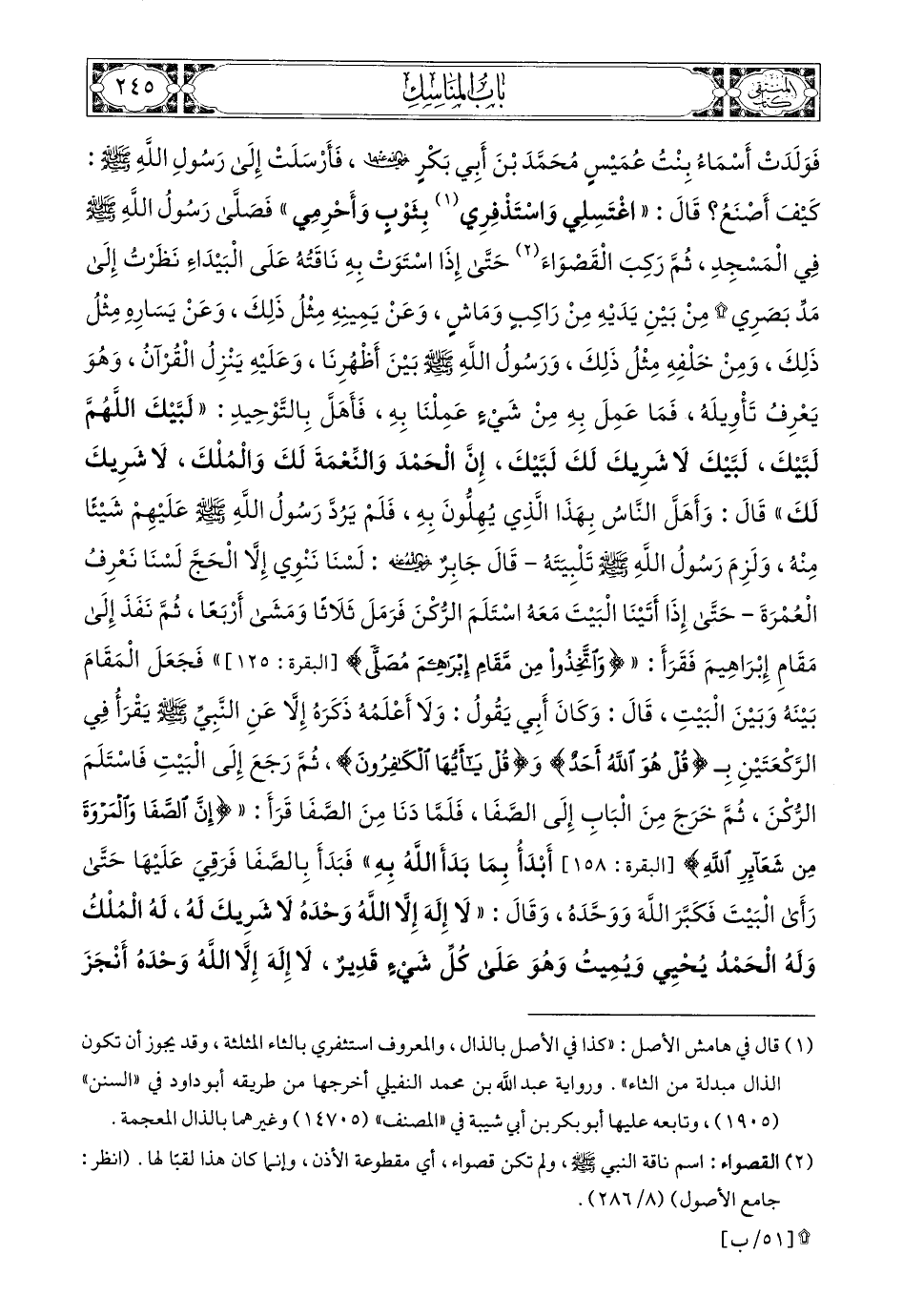 ثُمَّ خَرَجَ مِنَ الْبَابِ إِلَى الصَّفَا فَلَمَّا دَنَا مِنَ الصَّفَا قَرَأَ {إِنَّ الصَّفَا وَالْمَرْوَةَ مِنْ شَعَائِرِ اللَّهِ} [البقرة 158] أَبْدَأُ بِمَا بَدَأَ اللهُ بِهِ فَبَدَأَ بِالصَّفَا فَرَقِيَ عَلَيْهَا حَتَّى رَأَى الْبَيْتَ فَكَبَّرَ اللَّهَ وَوَحَّدَهُ، وَقَالَ: لاَ إِلَهَ إِلاَّ اللهُ وَحْدَهُ لاَ شَرِيكَ لَهُ لَهُ الْمُلْكُ وَلَهُ الْحَمْدُ يُحْيِي وَيُمِيتُ وَهُوَ عَلَى كُلِّ شَيْءٍ قَدِيرٌ، لاَ إِلَهَ إِلاَّ اللهُ وَحْدَهُ أَنْجَزَ وَعْدَهُ وَنَصَرَ عَبْدَهُ وَهَزَمَ الأَحْزَابَ وَحْدَهُ، ثُمَّ دَعَا بَيْنَ ذَلِكَ وَقَالَ مِثْلَ هَذَا ثَلاَثَ مَرَّاتٍ، ثُمَّ نَزَلَ إِلَى الْمَرْوَةِ حَتَّى إِذَا انْصَبَّتْ قَدَمَاهُ رَمَلَ فِي بَطْنِ الْوَادِي، حَتَّى إِذَا صَعِدْنَا مَشَى حَتَّى أَتَى الْمَرْوَةَ فَصَنَعَ عَلَى الْمَرْوَةِ كَمَا صَنَعَ عَلَى الصَّفَا، حَتَّى إِذَا كَانَ آخِرُ طَوَافٍ عَلَى الْمَرْوَةِ قَالَ: لَوْ أَنِّي اسْتَقْبَلْتُ مِنْ أَمْرِي مَا اسْتَدْبَرْتُ لَمْ أَسُقِ الْهَدْيَ وَلَجَعَلْتُهَا عُمْرَةً، فَمَنْ كَانَ مِنْكُمْ لَيْسَ مَعَهُ هَدْي فَلْيَحْلِلْ وَلْيَجْعَلْهَا عُمْرَةً، فَحَلَّ النَّاسُ كُلُّهُمْ وَقَصَّرُوا إِلاَّ النَّبِيُّ صَلى الله عَليه وسَلم وَمَنْ كَانَ مَعَهُ هَدْي، فَقَامَ سُرَاقَةُ بْنُ جُعْشُمٍ فَقَالَ: يَا رَسُولَ اللهِ أَلِعَامِنَا هَذَا أَمْ لأَبَدٍ فَشَبَّكَ رَسُولُ اللهِ صَلى الله عَليه وسَلم أَصَابِعَهُ فِي الأُخْرَى، ثُمَّ قَالَ: دَخَلْتِ الْعُمْرَةُ فِي الْحَجِّ هَكَذَا مَرَّتَيْنِ لاَ بَلْ لأَبَدِ أَبَدٍ، قَالَ: وَقَدِمَ عَلِيُّ، رَضِيَ اللهُ عَنْهُ، مِنَ الْيَمَنِ بِبُدْنِ النَّبِيِّ، فَوَجَدَ فَاطِمَةَ، رَضِيَ اللهُ عَنْهَا، تَرَجَّلَتْ وَلَبِسَتْ ثِيَابًا صَبِيغًا وَاكْتَحَلَتْ فَأَنْكَرَ عَلِيُّ، رَضِيَ اللهُ عَنْهُ، ذَلِكَ عَلَيْهَا، فَقَالَتْ: أَبِي أَمَرَنِي بِهَذَا قَالَ: فَكَانَ عَلِيُّ، رَضِيَ اللهُ عَنْهُ، يَقُولُ: ذَهَبْتُ إِلَى رَسُولِ اللهِ صَلى الله عَليه وسَلم مُحَرِّشًا عَلَى فَاطِمَةَ فِي الَّذِي صَنَعَتْ مُسْتَفْتِيًا لِرَسُولِ اللهِ صَلى الله عَليه وسَلم فِي الَّذِي ذَكَرَتْ عَنْهُ، وَأَنْكَرْتُ ذَلِكَ عَلَيْهَا فَقَالَ: صَدَقَتْ صَدَقَتْ مَاذَا قُلْتَ حِينَ فَرَضْتَ الْحَجَّ؟ قَالَ: قُلْتُ اللهُمَّ إِنِّي أُهِلُّ بِمَا أَهَلَّ بِهِ رَسُولُكَ صَلى الله عَليه وسَلم، قَالَ: فَإِنَّ مَعِيَ الْهَدْي فَلاَ تَحْلِلْ فَكَانَ جَمَاعَةُ الْهَدْيِ مِنَ الَّذِي قَدِمَ بِهِ عَلِيُّ مِنَ الْيَمَنِ وَالَّذِي أَتَى بِهِ النَّبِيُّ صَلى الله عَليه وسَلم مِنَ الْمَدِينَةِ مِئَةً، فَحَلَّ النَّاسُ كُلُّهُمْ وَقَصَّرُوا إِلاَّ النَّبِيُّ صَلى الله عَليه وسَلم وَمَنْ كَانَ مَعَهُ هَدْيٌ، فَلَمَّا كَانَ يَوْمُ التَّرْوِيَةِ وَوَجَّهُوا إِلَى مِنًى أَهَلُّوا بِالْحَجِّ،
