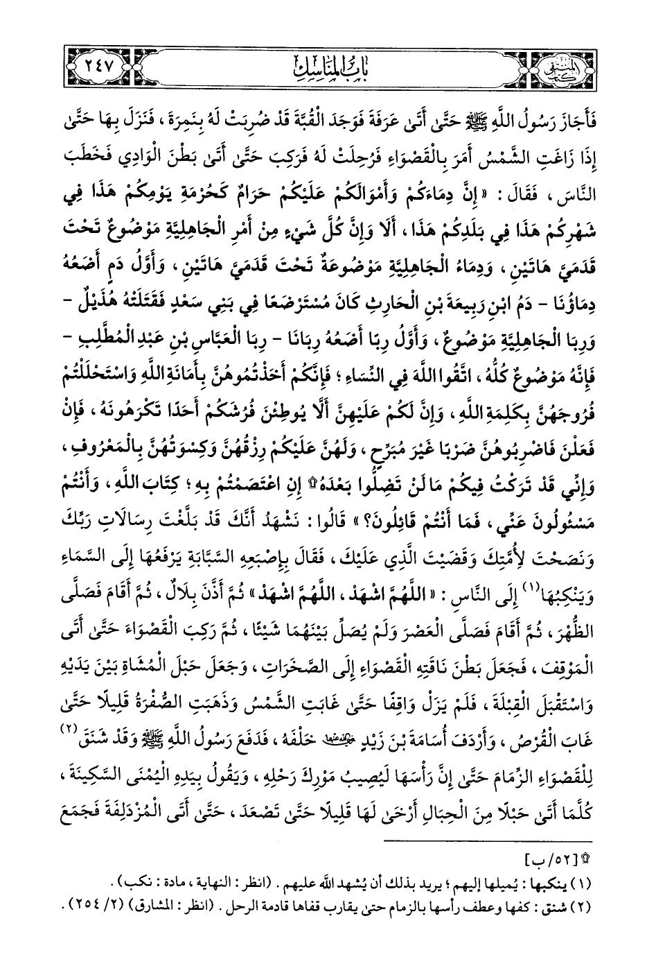 حَتَّى إِنَّ رَأْسَهَا لَيُصِيبُ مَوْرِكَ رَحْلِهِ وَيَقُولُ بِيَدِهِ الْيُمْنَى السَّكِينَةَ كُلَّمَا أَتَى حَبْلاً مِنَ الْحِبَالِ أَرْخَى لَهَا قَلِيلاً حَتَّى تَصْعَدَ حَتَّى أَتَى الْمُزْدَلِفَةَ فَجَمَعَ بَيْنَ الْمَغْرِبِ وَالْعِشَاءِ بِأَذَانٍ وَاحِدٍ وَإِقَامَتَيْنِ، ثُمَّ اضْطَجَعَ رَسُولُ اللهِ صَلى الله عَليه وسَلم حَتَّى طَلَعَ الْفَجْرُ فَصَلَّى الْفَجْرَ حَتَّى تَبَيَّنَ الصُّبْحُ قَالَ ابْنُ يَحْيَى: قَالَ لَنَا الْحَسَنُ بْنُ بِشْرٍ فِي هَذَا الْحَدِيثِ عَنْ حَاتِمٍ: فِي هَذَا الْمَوْضِعِ بِأَذَانٍ وَإِقَامَةٍ وَلَمْ يَقُلْهُ النُّفَيْلِيُّ، ثُمَّ رَكِبَ الْقَصْوَاءَ حَتَّى أَتَى الْمَشْعَرَ الْحَرَامَ فَرَقِيَ عَلَيْهِ فَحَمِدَ اللَّهَ وَكَبَّرَهُ وَهَلَّلَهُ فَلَمْ يَزَلْ وَاقِفًا حَتَّى أَسْفَرَ جِدًّا، ثُمَّ دَفَعَ رَسُولُ اللهِ صَلى الله عَليه وسَلم قَبْلَ أَنْ تَطْلُعَ الشَّمْسُ وَأَرْدَفَ الْفَضْلَ بْنَ عَبَّاسٍ، رَضِيَ اللهُ عَنْهُمَا وَكَانَ رَجُلاً حَسَنَ الشَّعْرِ أَبْيَضَ وَسِيمًا، فَلَمَّا دَفَعَ رَسُولُ اللهِ صَلى الله عَليه وسَلم مَرَّ الظُّعْنُ يَجْرِينَ فَطَفِقَ الْفَضْلُ يَنْظُرُ إِلَيْهِنَّ، فَوَضَعَ رَسُولُ اللهِ صَلى الله عَليه وسَلم يَدَهُ عَلَى وَجْهِ الْفَضْلِ، وَيَصْرِفُ الْفَضْلُ وَجْهَهُ إِلَى الشِّقِّ الآخَرِ يَنْظُرُ حَتَّى إِذَا أَتَى مُحَسِّرًا حَرَّكَ قَلِيلاً، ثُمَّ سَلَكَ الطَّرِيقَ الْوسْطَى الَّتِي تُخْرِجُكَ عَلَى الْجَمْرَةِ الْكُبْرَى، حَتَّى أَتَى الْجَمْرَةَ الَّتِي عِنْدَ الشَّجَرَةِ فَرَمَى بِسَبْعِ حَصَيَاتٍ يُكَبِّرُ مَعَ كُلِّ حَصَاةٍ مِنْهَا حَصَى الْخَذْفُ، رَمَى مِنْ بَطْنِ الْوَادِي، ثُمَّ انْصَرَفَ إِلَى الْمَنْحَرِ فَنَحَرَ بِيَدِهِ ثَلاَثًا وَسِتِّينَ وَأَمَرَ عَلِيًّا، رَضِيَ اللهُ عَنْهُ، فَنَحَرَ مَا غَبَرَ، يَقُولُ مَا بَقِيَ وَأَشْرَكَهُ فِي الْهَدْيِ، ثُمَّ أَمَرَ مِنْ كُلِّ بَدَنَةٍ بِبَضْعَةٍ فَجُعِلَتْ فِي قِدْرٍ فَطُبِخَتْ فَأَكَلاَ مِنْ لَحْمِهَا وَشَرِبَا مِنْ مَرَقِهَا، ثُمَّ أَفَاضَ رَسُولُ اللهِ صَلى الله عَليه وسَلم إِلَى الْبَيْتِ فَصَلَّى بِمَكَّةَ الظُّهْرَ، فَأَتَى بَنِي عَبْدِ الْمُطَّلِبِ وَهُمْ يَسْقُونَ عَلَى زَمْزَمَ فَقَالَ: انْزِعُوا بَنِي عَبْدِ الْمُطَّلِبِ فَلَوْلاَ أَنْ يَغْلِبَكُمُ النَّاسُ عَلَى سِقَايَتِكُمْ لَنَزَعْتُ مَعَكُمْ، فَنَاوَلُوهُ دَلْوًا فَشَرِبَ صَلى الله عَليه وسَلم مِنْهُ.