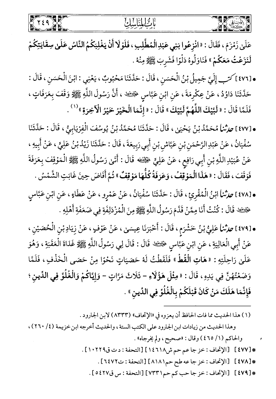 479- حَدَّثَنَا عَلِيُّ بْنُ خَشْرَمٍ، قَالَ: أَخْبَرَنَا عِيسَى، عَنْ عَوْفٍ، عَنْ زِيَادِ بْنِ الْحُصَيْنِ، عَنْ أَبِي الْعَالِيَةِ، عَنِ ابْنِ عَبَّاسٍ، رَضِيَ اللهُ عَنْهُمَا، قَالَ: قَالَ لِي رَسُولُ اللهِ صَلى الله عَليه وسَلم غَدَاةَ الْعَقَبَةِ وَهُوَ عَلَى رَاحِلَتِهِ: هَاتِ الْقُطْ، فَلَقَطْتُ لَهُ حَصَيَاتٍ نَحْوًا مِنْ حَصَى الْخَذْفِ فَلَمَّا وَضَعْتُهُنَّ فِي يَدِهِ قَالَ: مِثْلُ هَؤُلاَءِ ثَلاَثَ مَرَّاتٍ وَإِيَّاكُمْ وَالْغُلُوَّ فِي الدِّينِ فَإِنَّمَا هَلَكَ مَنْ كَانَ قَبْلَكُمْ بِالْغُلُوِّ فِي الدِّينِ.