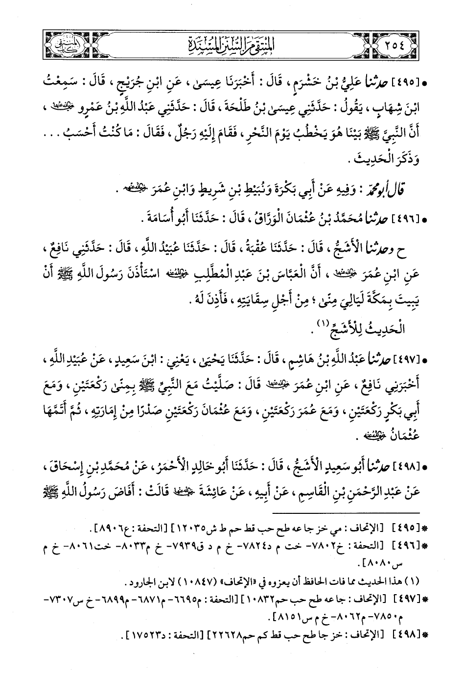 496- حَدَّثَنَا مُحَمَّدُ بْنُ عُثْمَانَ الْوَرَّاقُ، قَالَ: حَدَّثَنَا أَبُو أُسَامَةَ (ح) وَحَدَّثَنَا الأَشَجُّ، قَالَ: حَدَّثَنَا عُقْبَةُ، قَالَ: حَدَّثَنَا عُبَيْدُ اللهِ، قَالَ: حَدَّثَنِي نَافِعٌ، عَنِ ابْنِ عُمَرَ، رَضِيَ اللهُ عَنْهُمَا أَنَّ الْعَبَّاسَ بْنَ عَبْدِ الْمُطَّلِبِ، رَضِيَ اللهُ عَنْهُ، اسْتَأْذَنَ رَسُولَ اللهِ صَلى الله عَليه وسَلم أَنْ يَبِيتَ بِمَكَّةَ لَيَالِيَ مِنًى مِنْ أَجْلِ سِقَايَتِهِ فَأَذِنَ لَهُ.