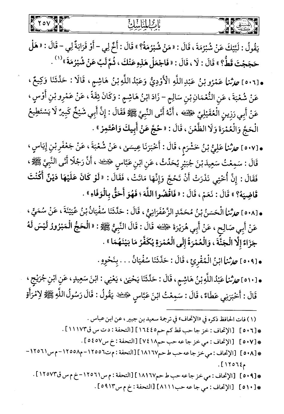 508- حَدَّثَنَا الْحَسَنُ بْنُ مُحَمَّدٍ الزَّعْفَرَانِيُّ، قَالَ: حَدَّثَنَا سُفْيَانُ بْنُ عُيَيْنَةَ، عَنْ سُمَيٍّ، عَنْ أَبِي صَالِحٍ، عَنْ أَبِي هُرَيْرَةَ، رَضِيَ اللهُ عَنْهُ، قَالَ: قَالَ النَّبِيُّ صَلى الله عَليه وسَلم: الْحَجُّ الْمَبْرُورُ لَيْسَ لَهُ جَزَاءٌ إِلاَّ الْجَنَّةَ وَالْعُمْرَةُ إِلَى الْعُمْرَةِ يُكَفِّرُ مَا بَيْنَهُمَا.