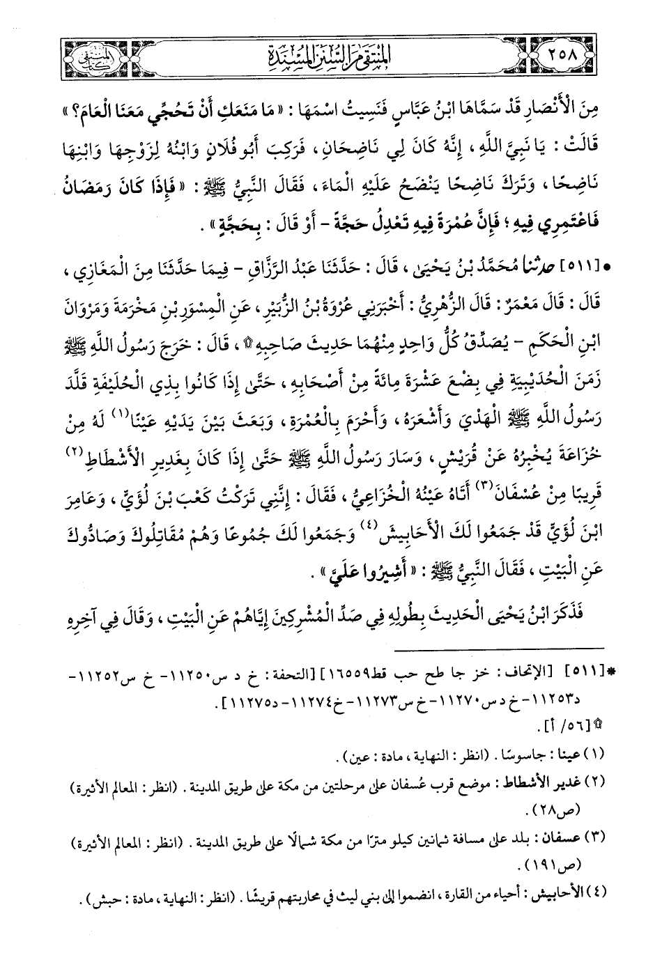 511- حَدَّثَنَا مُحَمَّدُ بْنُ يَحْيَى، قَالَ: حَدَّثَنَا عَبْدُ الرَّزَّاقِ، فِيمَا حَدَّثَنَا مِنَ الْمَغَازِي، قَالَ: قَالَ مَعْمَرٌ، قَالَ الزُّهْرِيُّ: أَخْبَرَنِي عُرْوَةُ بْنُ الزُّبَيْرِ، عَنِ الْمِسْوَرِ بْنِ مَخْرَمَةَ، وَمَرْوَانَ بْنِ الْحَكَمِ يُصَدِّقُ كُلُّ وَاحِدٍ مِنْهُمَا حَدِيثَ صَاحِبِهِ، قَالَ: خَرَجَ رَسُولُ اللهِ صَلى الله عَليه وسَلم زَمَنَ الْحُدَيْبِيَةِ فِي بِضْعَ عَشْرَةَ مِئَةً مِنْ أَصْحَابِهِ حَتَّى إِذَا كَانُوا بِذِي الْحُلَيْفَةِ قَلَّدَ رَسُولُ اللهِ صَلى الله عَليه وسَلم الْهَدْيَ وَأَشْعَرَهُ، وَأَحْرَمَ بِالْعُمْرَةِ وَبَعَثَ بَيْنَ يَدَيْهِ عَيْنًا لَهُ مِنْ خُزَاعَةَ يُخْبِرُهُ عَنْ قُرَيْشٍ، وَسَارَ رَسُولُ اللهِ صَلى الله عَليه وسَلم حَتَّى إِذَا كَانَ بِغَدِيرِ الأَشْطَاطِ قَرِيبًا مِنْ عُسْفَانَ، أَتَاهُ عَيْنُهُ الْخُزَاعِيُّ، فَقَالَ: إِنَّنِي تَرَكْتُ كَعْبَ بْنَ لُؤَيٍّ، وَعَامِرَ بْنَ لُؤَيٍّ قَدْ جَمَعُوا لَكَ الأَحَابِيشَ وَجَمَعُوا لَكَ جُمُوعًا وَهُمْ مُقَاتِلُوكَ وَصَادُّوكَ عَنِ الْبَيْتِ، فَقَالَ النَّبِيُّ صَلى الله عَليه وسَلم: أَشِيرُوا عَلَيَّ، فَذَكَرَ ابْنُ يَحْيَى الْحَدِيثَ بِطُولِهِ فِي صَدِّ الْمُشْرِكِينَ إِيَّاهُمْ عَنِ الْبَيْتِ، وَقَالَ فِي آخِرِهِ بَعْدَ ذِكْرِ الْقَضِيَّةِ: قَالَ رَسُولُ اللهِ صَلى الله عَليه وسَلم لأَصْحَابِهِ: قُومُوا فَانْحَرُوا، ثُمَّ احْلِقُوا، وَذَكَرَ بَقِيَّةَ الْحَدِيثِ.