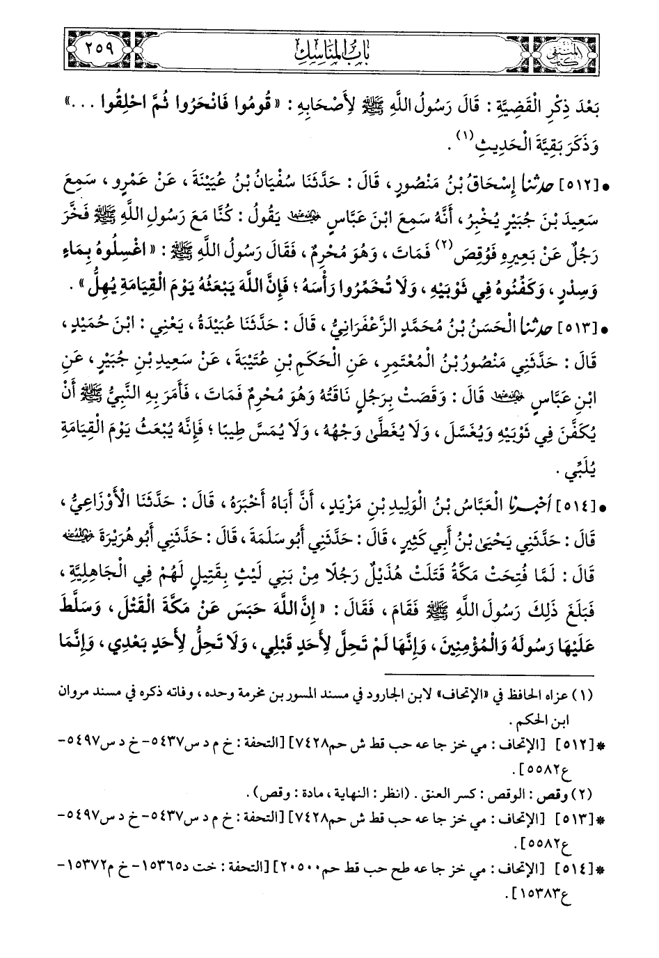 513- حَدَّثَنَا الْحَسَنُ بْنُ مُحَمَّدٍ الزَّعْفَرَانِيُّ، قَالَ: حَدَّثَنَا عُبَيْدَةُ، يَعْنِي ابْنَ حُمَيْدٍ، قَالَ: حَدَّثَنِي مَنْصُورُ بْنُ الْمُعْتَمِرِ عَنِ الْحَكَمِ بْنِ عُتَيْبَةَ، عَنْ سَعِيدِ بْنِ جُبَيْرٍ، عَنِ ابْنِ عَبَّاسٍ، رَضِيَ اللهُ عَنْهُمَا، قَالَ: وَقَصَتْ بِرَجُلٍ نَاقَتُهُ وَهُوَ مُحْرِمٌ فَمَاتَ فَأَمَرَ بِهِ النَّبِيُّ صَلى الله عَليه وسَلم أَنْ يُكَفَّنَ فِي ثَوْبَيْهِ وَيُغَسَّلَ وَلاَ يُغَطَّى وَجْهُهُ وَلاَ يُمَسَّ طِيبًا فَإِنَّهُ يُبْعَثُ يَوْمَ الْقِيَامَةِ يُلَبِّي.