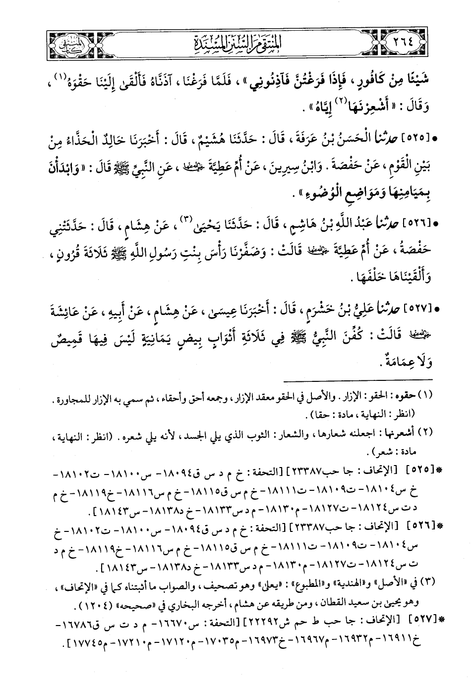525 - حَدَّثَنَا الْحَسَنُ بْنُ عَرَفَةَ، قَالَ: حَدَّثَنَا هُشَيْمٌ، قَالَ: أَخْبَرَنَا خَالِدٌ الْحَذَّاءُ، مِنْ بَيْنِ الْقَوْمِ، عَنْ حَفْصَةَ، وَابْنُ سِيرِينَ، عَنْ أُمِّ عَطِيَّةَ، رَضِيَ اللهُ عَنْهَا، عَنِ النَّبِيِّ صَلى الله عَليه وسَلم قَالَ: وَابْدَأْنَ بِمَيَامِنِهَا وَمَوَاضِعِ الْوُضُوءِ.