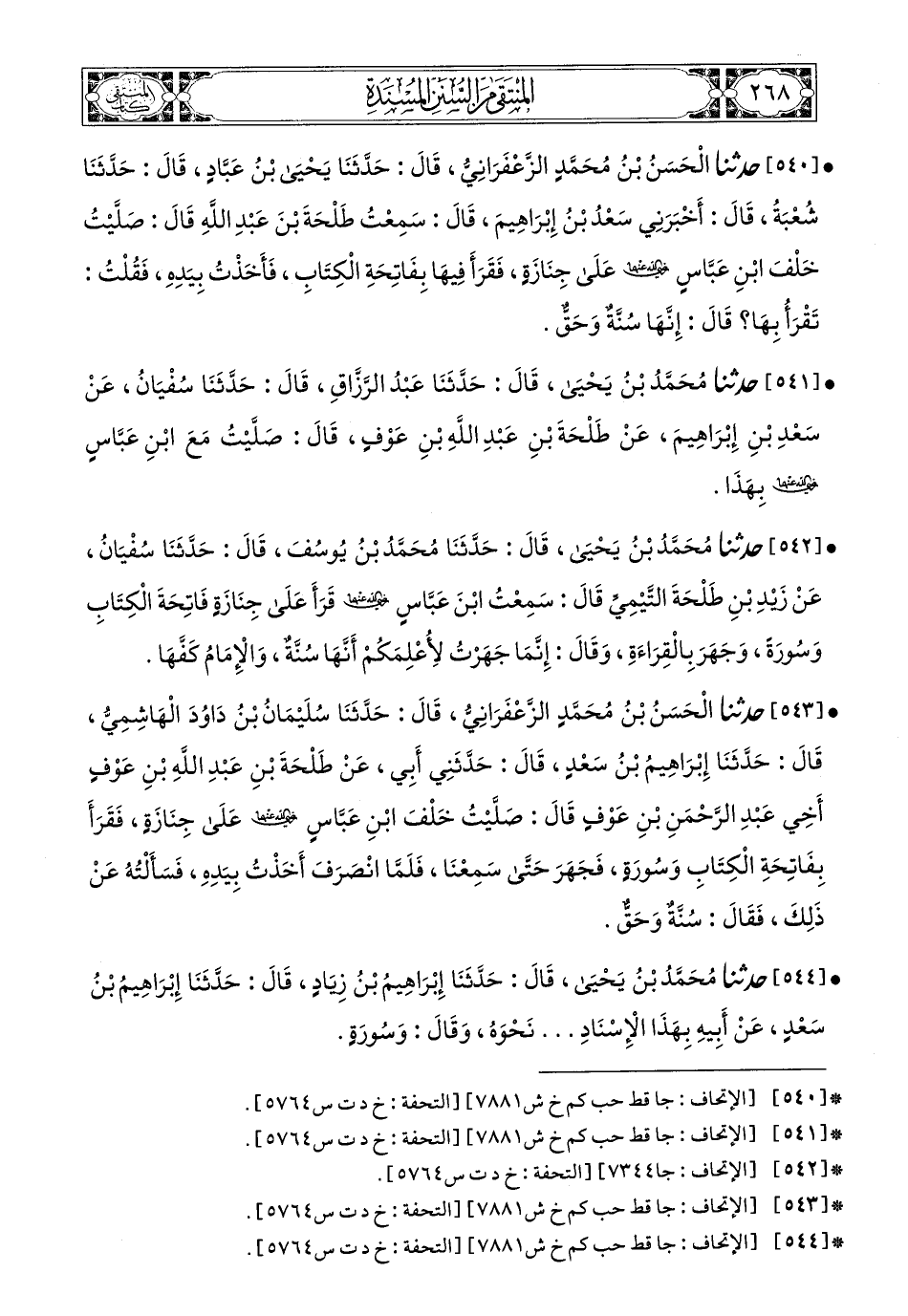 540 - حَدَّثَنَا الْحَسَنُ بْنُ مُحَمَّدٍ الزَّعْفَرَانِيُّ، قَالَ: حَدَّثَنَا يَحْيَى بْنُ عَبَّادٍ، قَالَ: حَدَّثَنَا شُعْبَةُ، قَالَ: أَخْبَرَنِي سَعْدُ بْنُ إِبْرَاهِيمَ، قَالَ: سَمِعْتُ طَلْحَةَ بْنَ عَبْدِ اللهِ، قَالَ: صَلَّيْتُ خَلْفَ ابْنِ عَبَّاسٍ، رَضِيَ اللهُ عَنْهُمَا عَلَى جِنَازَةٍ فَقَرَأَ فِيهَا بِفَاتِحَةِ الْكِتَابِ فَأَخَذْتُ بِيَدِهِ فَقُلْتُ: تَقْرَأُ بِهَا؟ قَالَ: إِنَّهَا سُنَّةٌ وَحَقٌّ.