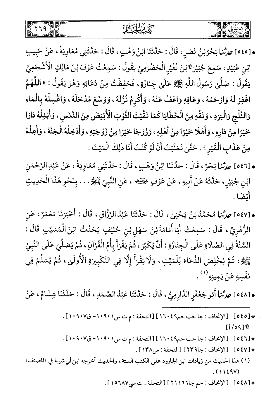 545 - حَدَّثَنَا بَحْرُ بْنُ نَصْرٍ، قَالَ: حَدَّثَنَا ابْنُ وَهْبٍ، قَالَ: حَدَّثَنِي مُعَاوِيَةُ عَنْ حَبِيبِ بْنِ عُبَيْدٍ، سَمِعَ جُبَيْرَ بْنَ نُفَيْرٍ الْحَضْرَمِيَّ، يَقُولُ: سَمِعْتُ عَوْفَ بْنَ مَالِكٍ الأَشْجَعِيَّ، يَقُولُ: صَلَّى رَسُولُ اللهِ صَلى الله عَليه وسَلم عَلَى جِنَازَةٍ فَحَفِظْتُ مِنْ دُعَائِهِ وَهُوَ يَقُولُ: اللهُمَّ اغْفِرْ لَهُ وَارْحَمْهُ وَعَافِهِ وَاعْفُ عَنْهُ وَأَكْرِمْ نُزُلَهُ وَوَسِّعْ مُدْخَلَهُ وَاغْسِلْهُ بِالْمَاءِ وَالثَّلْجِ وَالْبَرَدِ وَنَقِّهِ مِنَ الْخَطَايَا كَمَا نَقَّيْتَ الثَّوْبَ الأَبْيَضَ مِنَ الدَّنَسِ وَأَبْدِلْهُ دَارًا خَيْرًا مِنْ دَارِهِ وَأَهْلاً خَيْرًا مِنْ أَهْلِهِ وَزَوْجًا خَيْرًا مِنْ زَوْجَتِهِ وَأَدْخِلْهُ الْجَنَّةَ وَأَعِذْهُ مِنْ عَذَابِ الْقَبْرِ، حَتَّى تَمَنَّيْتُ أَنْ لَوْ كُنْتُ أَنَا ذَلِكُ الْمَيِّتَ.