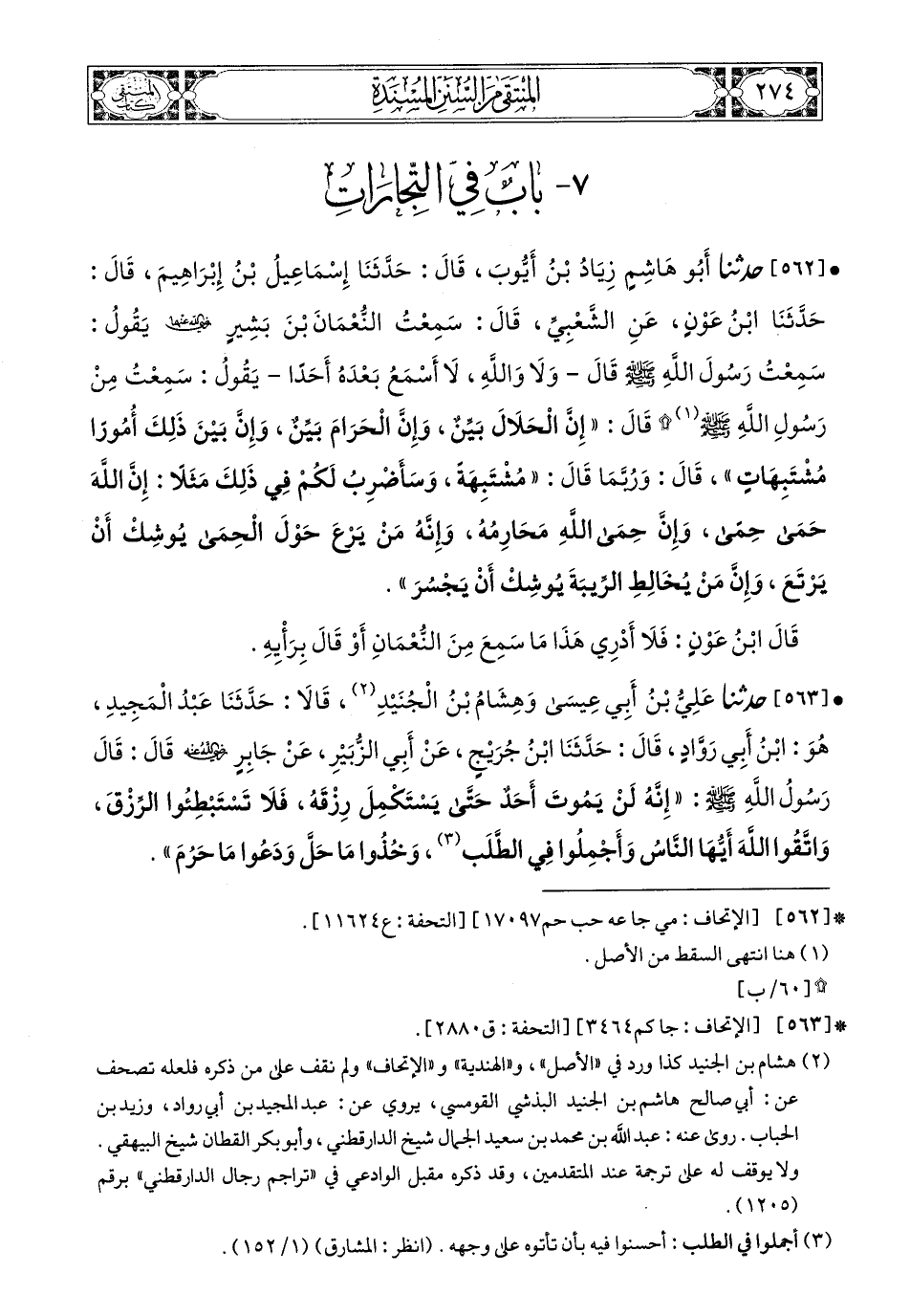 563 - حَدَّثَنَا عَلِيُّ بْنُ أَبِي عِيسَى، وَهِشَامُ بْنُ الْجُنَيْدِ، قَالاَ: حَدَّثَنَا عَبْدُ الْمَجِيدِ هُوَ ابْنُ أَبِي رَوَّادٍ، قَالَ: حَدَّثَنَا ابْنُ جُرَيْجٍ، عَنْ أَبِي الزُّبَيْرِ، عَنْ جَابِرٍ، رَضِيَ اللهُ عَنْهُ، قَالَ: قَالَ رَسُولُ اللهِ صَلى الله عَليه وسَلم: إِنَّهُ لَنْ يَمُوتَ أَحَدٌا حَتَّى يَسْتَكْمِلَ رِزْقَهُ فَلاَ تَسْتَبْطِئُوا الرِّزْقَ وَاتَّقُوا اللَّهَ أَيُّهَا النَّاسُ وَأَجْمِلُوا فِي الطَّلَبِ وَخُذُوا مَا حَلَّ وَدَعُوا مَا حَرُمَ.