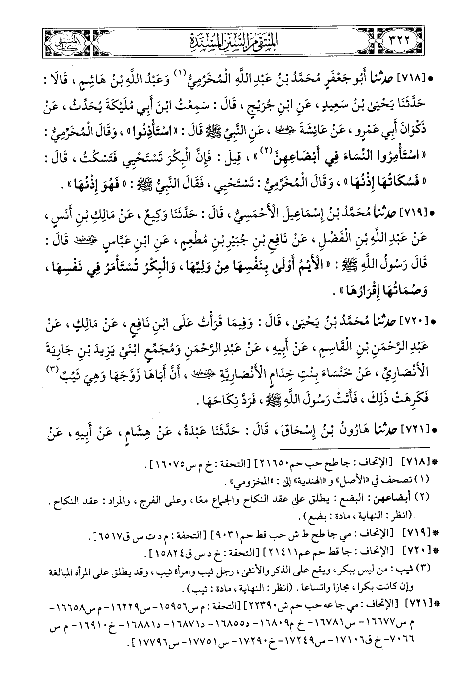 719- حَدَّثَنَا مُحَمَّدُ بْنُ إِسْمَاعِيلَ الأَحْمَسِيُّ، قَالَ: حَدَّثَنَا وَكِيعٌ، عَنْ مَالِكِ بْنِ أَنَسٍ، عَنْ عَبْدِ اللهِ بْنِ الْفَضْلِ، عَنْ نَافِعِ بْنِ جُبَيْرِ بْنِ مُطْعِمٍ، عَنِ ابْنِ عَبَّاسٍ، رَضِيَ اللهُ عَنْهُمَا، قَالَ: قَالَ رَسُولُ اللهِ صَلى الله عَليه وسَلم: الأَيِّمُ أَوْلَى بِنَفْسِهَا مِنْ وَلِيِّهَا، وَالْبِكْرُ تُسْتَأْمَرُ فِي نَفْسِهَا وَصُمَاتُهَا إِقْرَارُهَا.