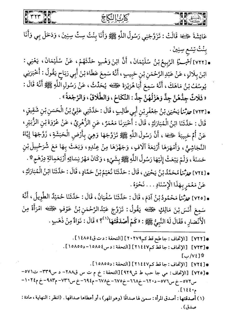 725- حَدَّثَنَا مَحْمُودُ بْنُ آدَمَ، قَالَ: حَدَّثَنَا سُفْيَانُ، قَالَ: حَدَّثَنَا حُمَيْدٌ الطَّوِيلُ، أَنَّهُ سَمِعَ أَنَسَ بْنَ مَالِكٍ، رَضِيَ اللهُ عَنْهُ، يَقُولُ: تَزَوَّجَ عَبْدُ الرَّحْمَنِ بْنُ عَوْفٍ، رَضِيَ اللهُ عَنْهُ، امْرَأَةً مِنَ الأَنْصَارِ، فَقَالَ لَهُ النَّبِيُّ صَلى الله عَليه وسَلم: كَمْ أَصْدَقْتَهَا؟ قَالَ: نَوَاةٌ مِنْ ذَهَبٍ.