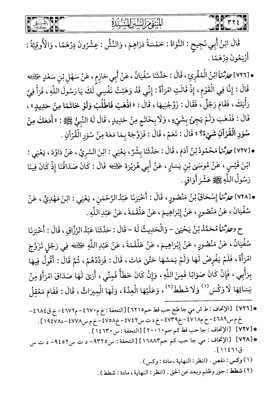 728- حَدَّثَنَا إِسْحَاقُ بْنُ مَنْصُورٍ، قَالَ: أَخْبَرَنَا عَبْدُ الرَّحْمَنِ، يَعْنِي ابْنَ مَهْدِيٍّ، عَنْ سُفْيَانَ، عَنْ مَنْصُورٍ، عَنْ إِبْرَاهِيمَ، عَنْ عَلْقَمَةَ، عَنْ عَبْدِ اللهِ (ح) وَحَدَّثَنَا مُحَمَّدُ بْنُ يَحْيَى، وَالْحَدِيثُ لَهُ، قَالَ: حَدَّثَنَا عَبْدُ الرَّزَّاقِ، قَالَ: أَخْبَرَنَا سُفْيَانُ، عَنْ مَنْصُورٍ، عَنْ إِبْرَاهِيمَ، عَنْ عَلْقَمَةَ، عَنْ عَبْدِ اللهِ، رَضِيَ اللهُ عَنْهُ، فِي رَجُلٍ تَزَوَّجَ امْرَأَةً فَلَمْ يَفْرِضْ لَهَا وَلَمْ يَمَسَّهَا حَتَّى مَاتَ، قَالَ: فَرَدَّدْهُمْ، ثُمَّ، قَالَ: أَقُولُ فِيهَا بِرَأْيِي فَإِنْ كَانَ صَوَابًا فَمِنَ اللهِ، وَإِنْ كَانَ خَطَأً فَمِنِّي، أَرَى لَهَا صَدَاقَ امْرَأَةٍ مِنْ نِسَائِهَا لاَ وَكْسَ وَلاَ شَطَطَ، وَعَلَيْهَا الْعِدَّةُ، وَلَهَا الْمِيرَاثُ قَالَ: فَقَامَ مَعْقِلُ بْنُ سِنَانٍ الأَشْجَعِيُّ فَقَالَ: أَشْهَدُ لَقَضَيْتَ فِيهَا بِقَضَاءِ رَسُولِ اللهِ صَلى الله عَليه وسَلم فِي بِرْوَعَ ابْنَةِ وَاشِقٍ امْرَأَةٍ مِنْ بَنِي رَوَّاسٍ، وَبَنُو رَوَّاسٍ حَيُّ مِنْ بَنِي عَامِرِ بْنِ صَعْصَعَةَ.